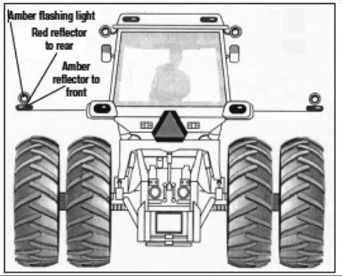 Tractors without dual wheels should have a minimum of one forward facing headlight and two rear facing red lights (or one red light and two red reflectors). The addition of flashing amber lights will further increase visibility to motorists.