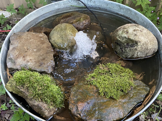 The downside is you have to be close to an electric outlet, but you’ll be surprised to see how many other winged, hooved and five-fingered critters will be attracted and appreciate your fresh cooling water fountain on a hot August day.