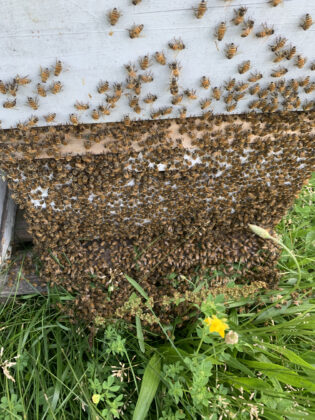 During periods of high temperatures and high humidity, the bees will self-regulate the hive temperature by adjusting the numbers and positions of bees on the exterior of the hive entrance. You can help the bees by having an available water source nearby so they don’t have to fly a distance to forage for water. This is also advisable because they may find your neighbor’s swimming pool and this becomes a source for another article.