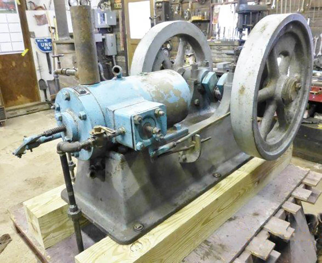 Clark bears no name, other than the 1976 nameplate, nor any casting numbers. Being unlike anything else Clark Brothers ever built made the members of CPM wonder if Clark could have been a prototype and the only one in existence. We will probably never know for sure, but it seems like the parent company entered engine building with this prototype. It was probably built circa 1895. He was four-stoke cycle and used many odd designs — note the odd rotary intake valve and throttle, as well as the friction governor. Clark was unusual but worked very well.