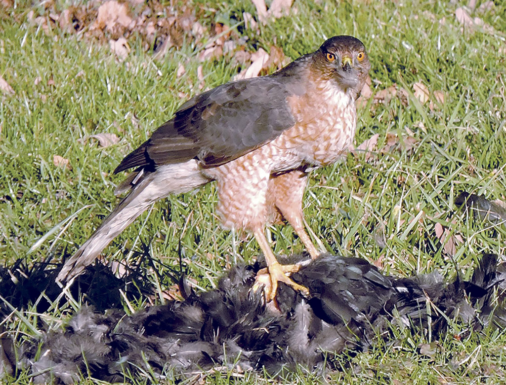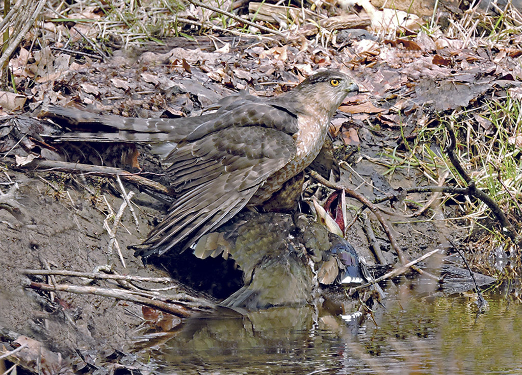 My most interesting experience with this species came while approaching a vernal pool one spring, deep within the woods, while conducting a salamander survey. As I neared the water, a pair of wood ducks launched nervously into the air. Seconds later I heard what sounded like a shot, followed by a smacking noise. I was so intrigued that I decided to investigate. Here, a young Cooper’s hawk, which obviously had been patiently awaiting the ducks’ departure, had taken out the female wood duck in midflight. After the initial hit, the two of them plummeted to earth, landing in a stream and smacking the surface of the water. The Cooper’s hawk struggled to hold the duck beneath the surface for many minutes until it finally drowned, then hoisted it up on the shore with all the might it could muster. I watched and photographed that hawk all day as it consumed the duck. It would take breaks and depart, then return to feast again. When all was said and done, the resourceful bird had left a pile of feathers and hardly a bit of waste.