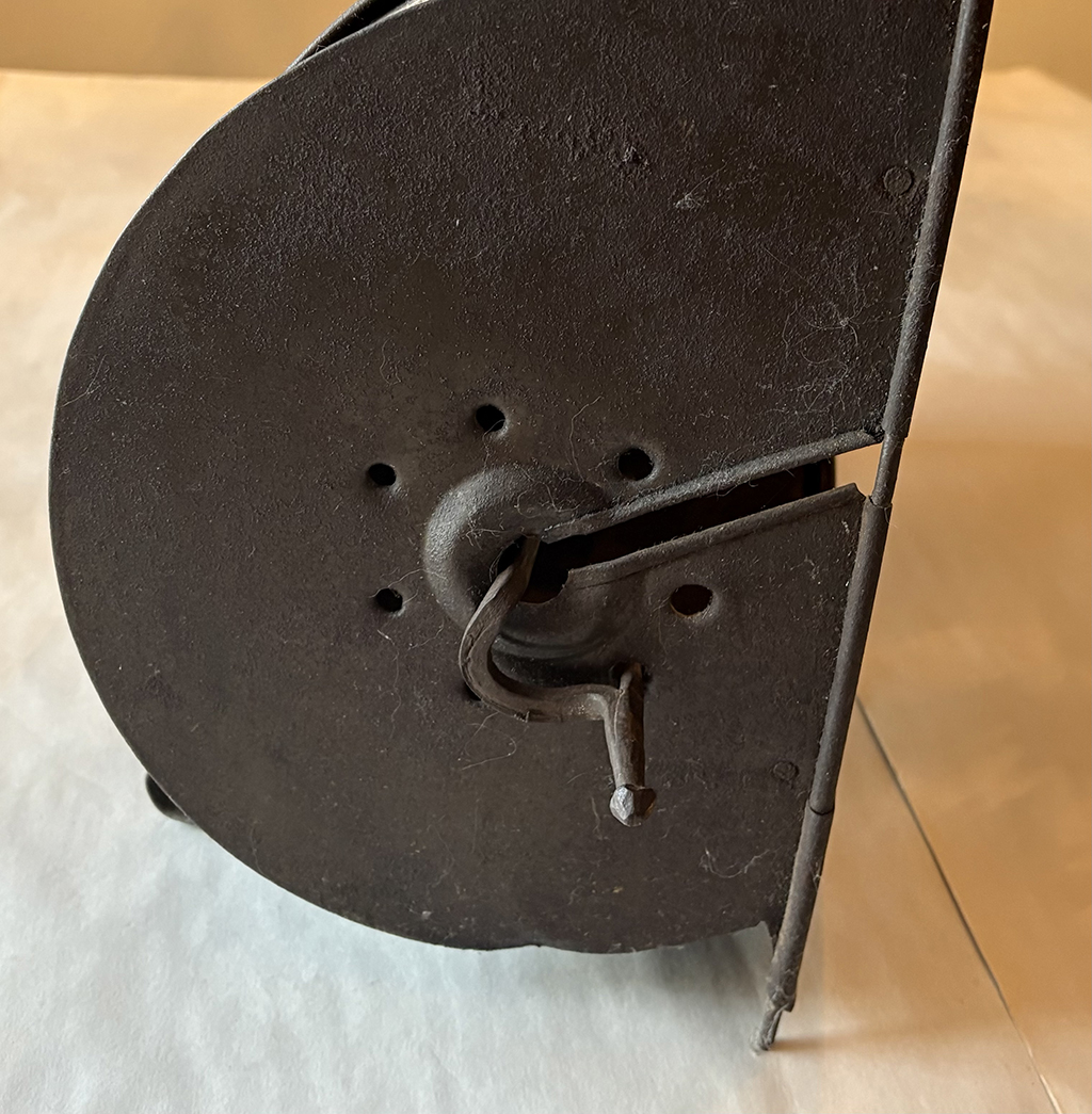 In terms of detail, the half-round oven was supported in front — the side facing away from the fire — by two small feet crafted from bent straps of tin. The rear of the oven was supported just above the hearth by short legs which were made as an integral part of the frame. Those legs extended upward above the top surface of the oven, terminating in a loop. The two loops enabled the cook to snare them with the hook on a poker in order to maneuver the hot kitchen as needed.
