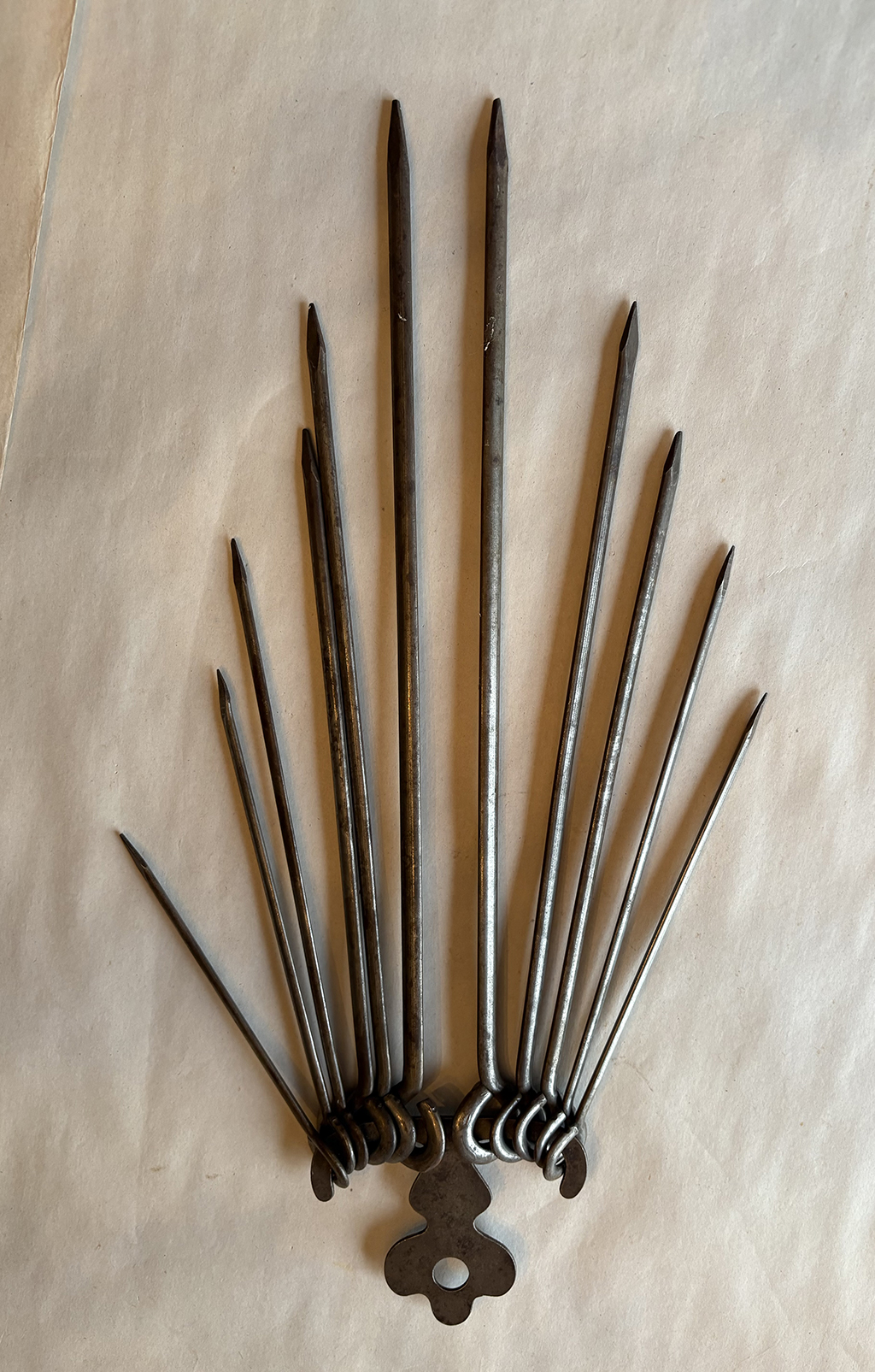 The wrought iron skewers were made in varying sizes and were hung on an iron skewer rack for convenience. The skewer rack was another fireplace accoutrement where the blacksmith could demonstrate his artistry, imagination and skill. Skewer racks are found in a wide variety of shapes. While hearts and diamonds were popular motifs, blacksmiths created many other designs as well, additionally embellishing them with punchwork, pierced work, decorative filing and more. The one thing all these skewer racks had in common were upward curved pins on which to hang the looped-end skewers. Also, when a blacksmith created a set of skewers, he usually made an especially fancy one, with decorative twists in the shaft. This special skewer would be placed in the meat when it was proudly served at the table.