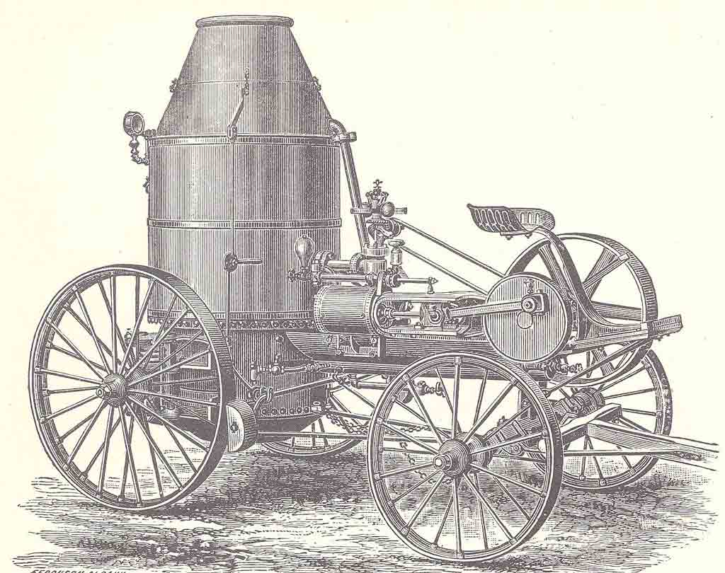 At first, portable steam engines were pulled from place to place by horses. During the 1870s, several inventors developed practical drive systems and the self-propelled steam traction engine became common as power for the many threshing rigs around the country.