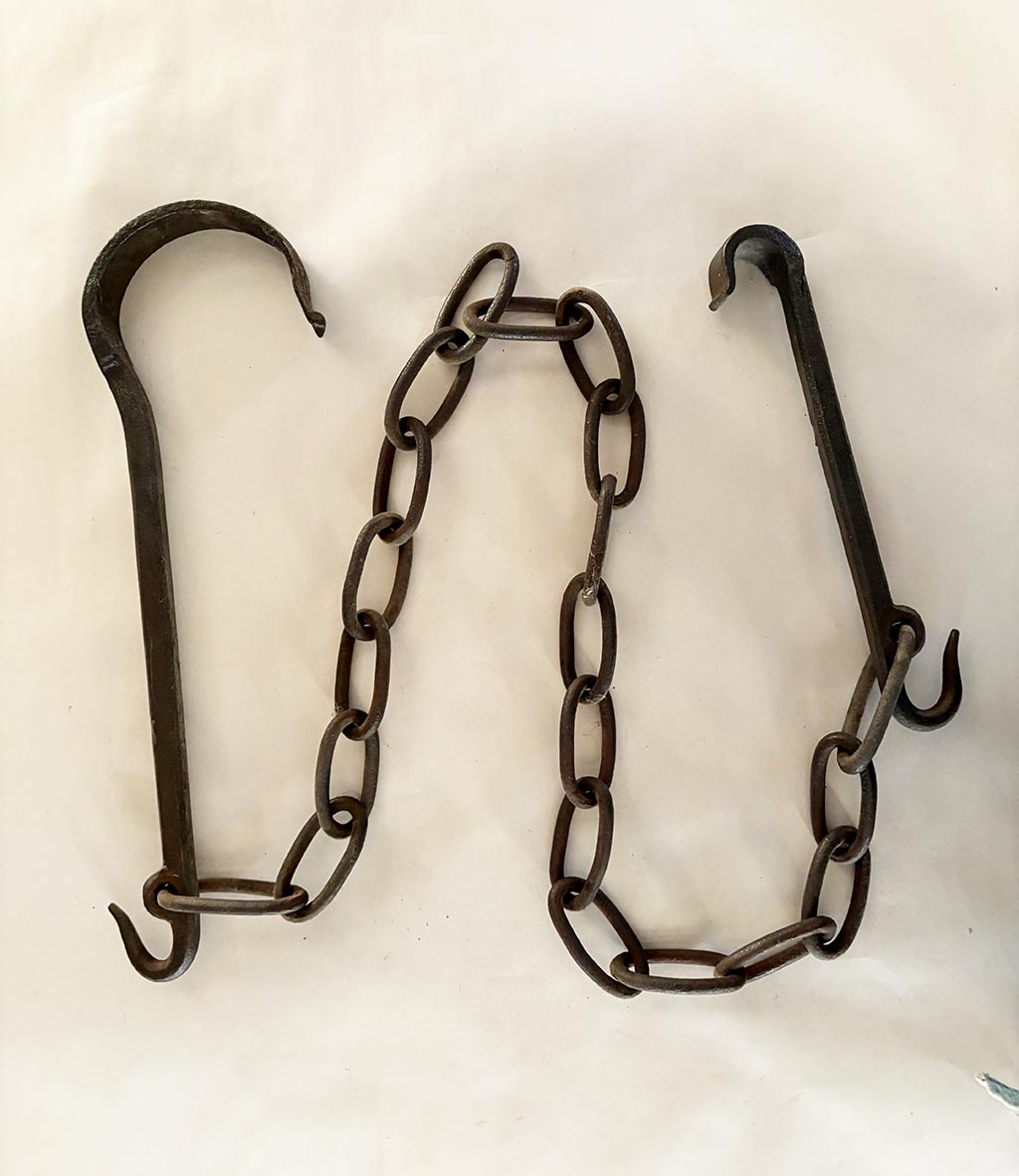 The chain trammel was a length of handmade iron links having a larger lug pole hook on one end and a smaller pot hook on the other. The pot hook, however, was crafted with a secondary hook that could be hung on any of the chain links, enabling the height of the cooking pot to be controlled.