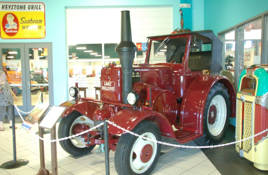 Nor are European tractors neglected: a beautiful Lanz Bulldog road tractor greets the visitor in the entry hall, while there is an English-built Fordson Major diesel; a 1947 French Vierzon FV-1 with a one-cylinder, hot-bulb engine; a 1954 Italian Landini, also powered by a single-cylinder, hot bulb engine; an English Field Marshall Mark I with a two-stroke, one cylinder, diesel engine; and two more Lanz Bulldogs.