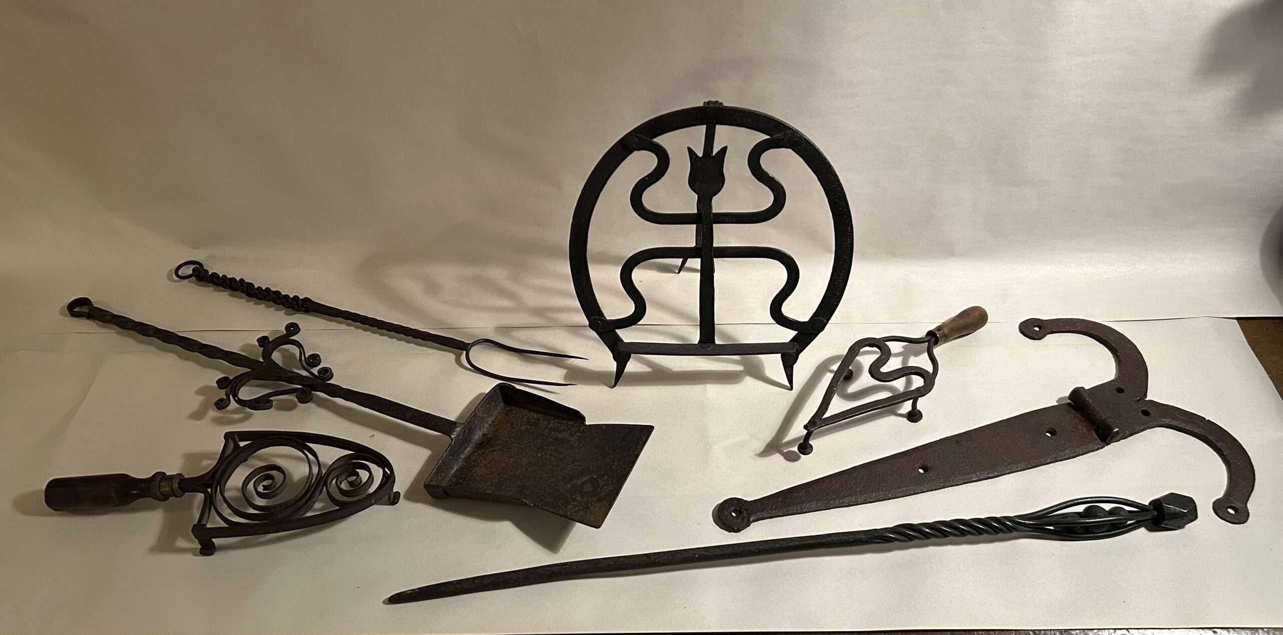 The blacksmith’s work encompassed a vast array of items, one of the largest categories of which was building hardware. He made hinges for doors, barns and gates, latches, hooks and locks, boot scrapers, nails by the thousands, pulleys, hasps and on and on. He crafted iron parts for wagons, all manner of tools for working the farms and gardens, and every kind of furnishing for a cooking fireplace including broilers, gridirons, trammels, roasters, spiders, trivets, toasters, dough scrapers, meat forks, peels, ladles, strainers, spatulas, spoons, skewers, tongs, pie crimpers, sugar nippers and the list goes on and on.