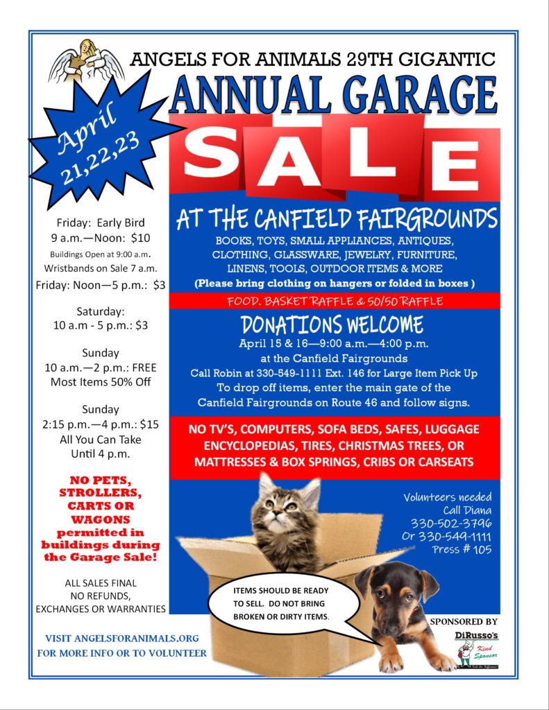 Angels for Animals is planning it’s largest fundraiser in just a few weeks at the Canfield Fairgrounds in Canfield Ohio. We are looking for donations, and volunteers at this point. See the attached flyers for information. Donations can be brought on Saturday, April 15 and Sunday April 15 at the times specified to the Canfield Fairgrounds. Individuals wishing to volunteer may contact Diana at the number on the flyer.