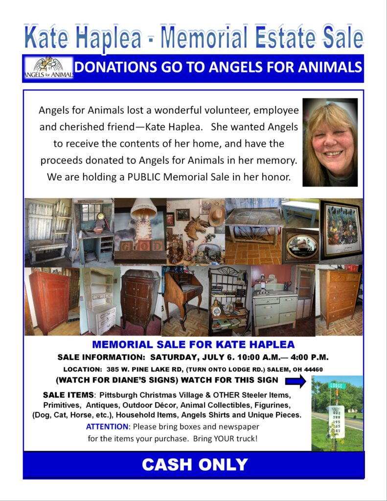 Angels for Animals lost a wonderful volunteer, employee and cherished friend—Kate Haplea. She wanted Angels to receive the contents of her home, and have the