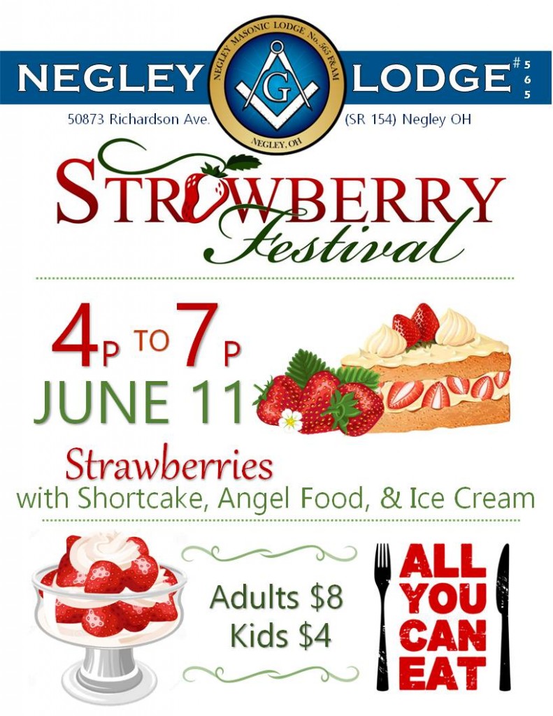 The Annual Negley Lodge #565 Strawberry Festival will be held Saturday Jun 11, from 4 p.m. to 7 p.m. All you can eat. $8 for Adults; $4 for kids. Strawberries, Angel Food Cake, Shortcake & Ice Cream.
