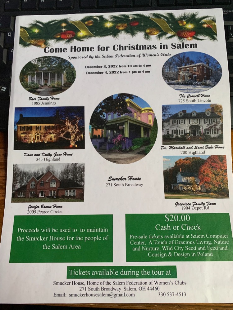 On the day of the tour, tickets will be sold at the Salem Federation of Women’s Clubs – Smucker House at 271 South Broadway in Salem.