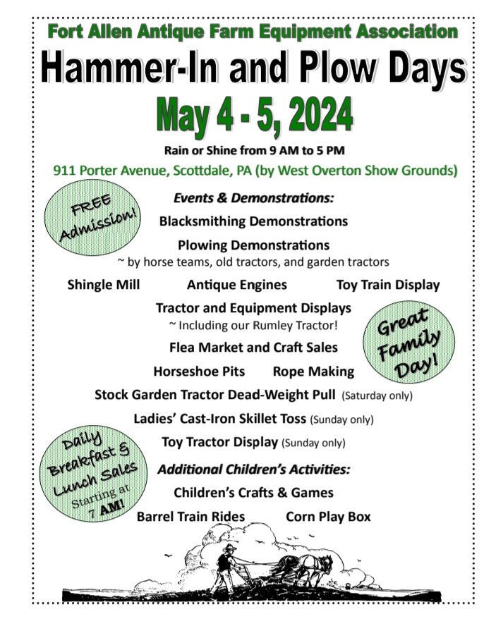 Free Admission! Blacksmithing, horse plowing, garden and antique tractor plowing, kids activities, rope making, sawmill, shingle mill, hit and miss engines, antique tractors, various types of antique farm equipment, stock garden pull (Saturday), ladies cast iron skillet tossing contest (Sunday), model train displays, toy tractor display (Sunday)