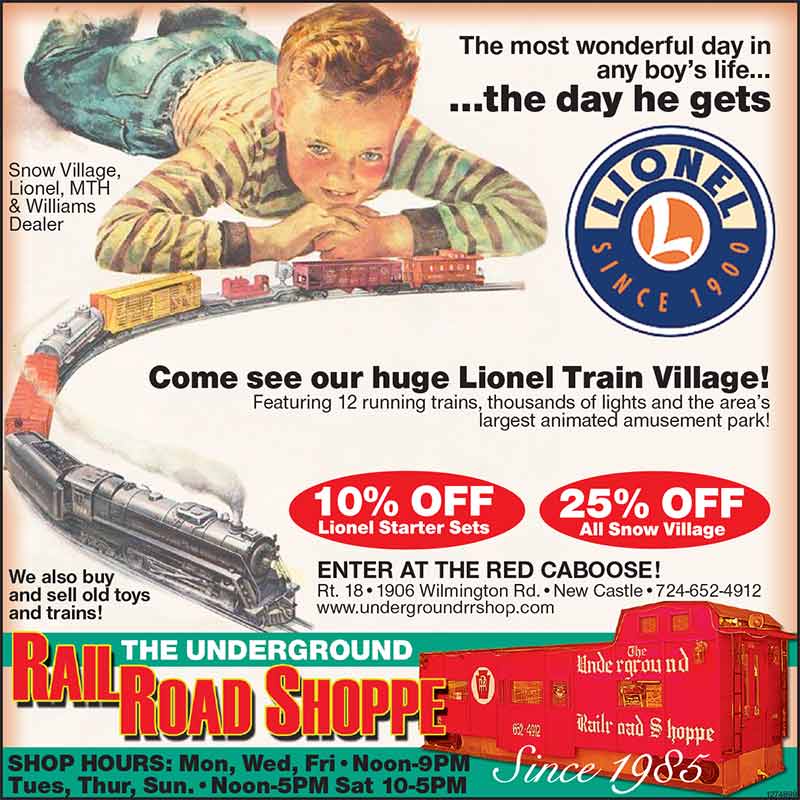 Come see our huge Lionel Train Village. Also, 10% off Lionel Starter Sets and 25% off All Snow Village. Open Now for the Holiday Season!