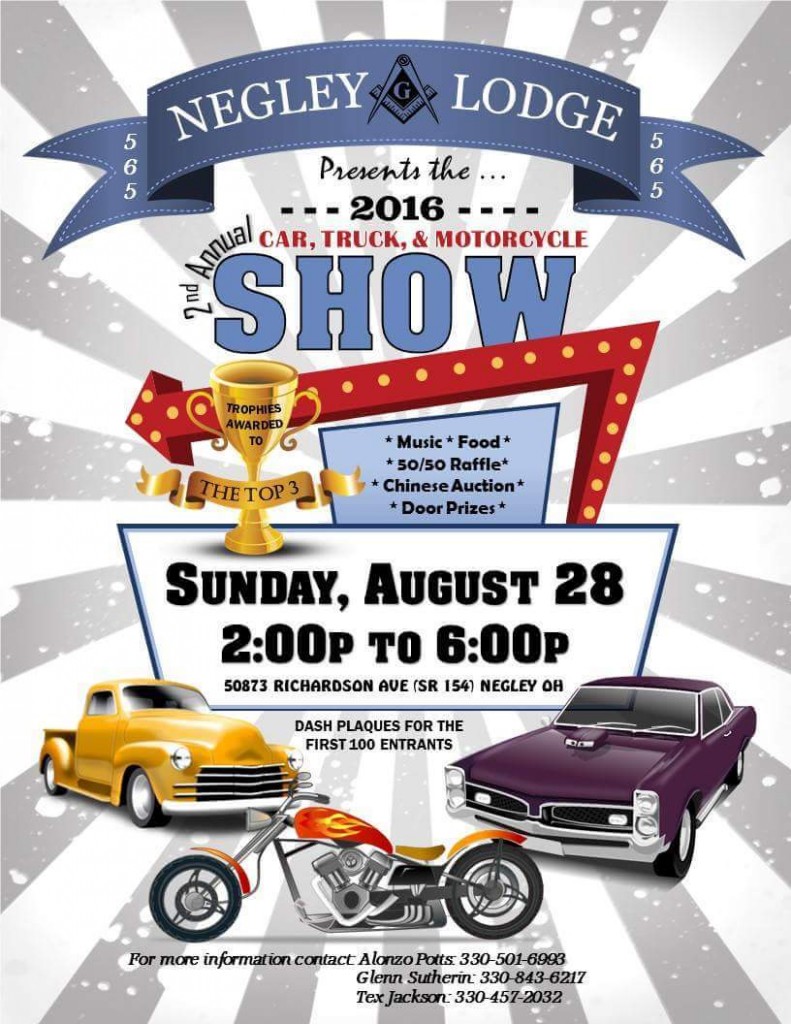 Negley Lodge 565 is having a car, truck and motorcycle show.