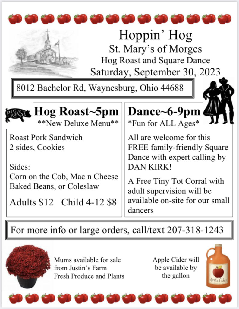 St. Mary’s – Morges is hosting their annual Hog Roast on Sept. 30th. This year’s event includes a Square Dance with professional caller Dan Kirk, as well as apple cider, a mums flower sale, and basket raffle. Meals are $12 for adults, $8 for children 4-12, and include a pulled pork sandwich, choice of sides, drink and dessert. The square dance with refreshments is free and open to all ages. An on-site child area with supervision is also provided for small square dancers. Dinner starts at 5 p.m., dance at 6 p.m. Call/text ahead for large carry-out orders 207-318-1243. All are welcome!