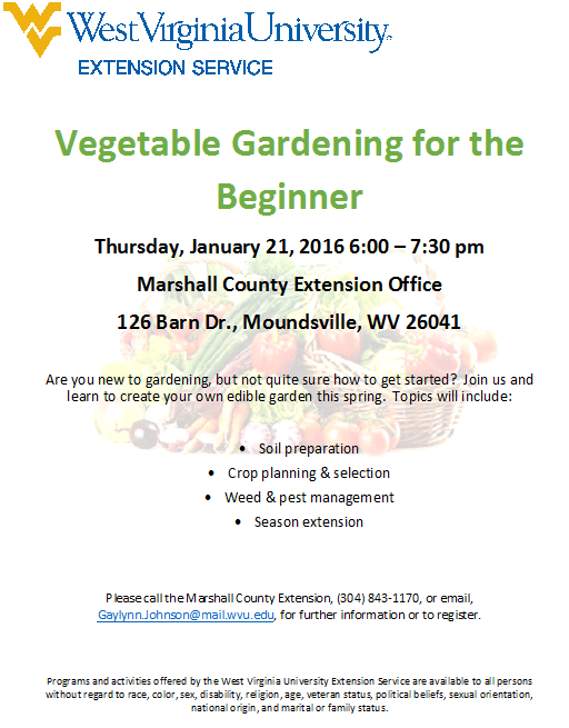 Please call the Marshall County Extension, (304) 843-1170, or email, Gaylynn.Johnson@mail.wvu.edu, for further information or to register.