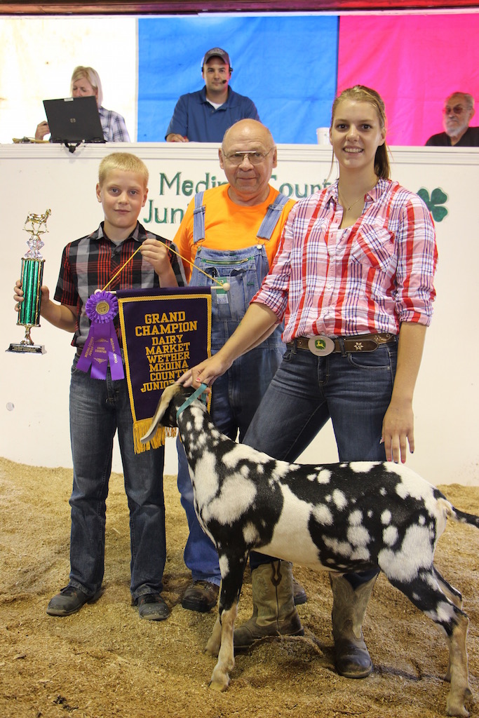 The Medina County Fair grand champion dairy goat, weighing 70 pounds, was shown by Ellie Kaufman, assisted by Ian Kaufman, and purchased by Pfister Orthodontics, represented by Tim Dull, for $10 per pound.