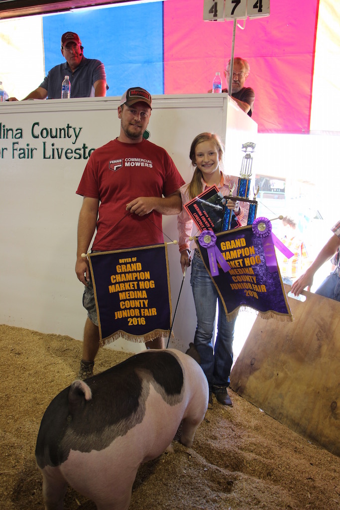 The Medina County Fair grand champion market hog, weighing 271 pounds, was shown by Allison Loftis, and purchased by Brad Bauman of Bauman Oil for $10 per pound. Loftis was also the premier hog showman.