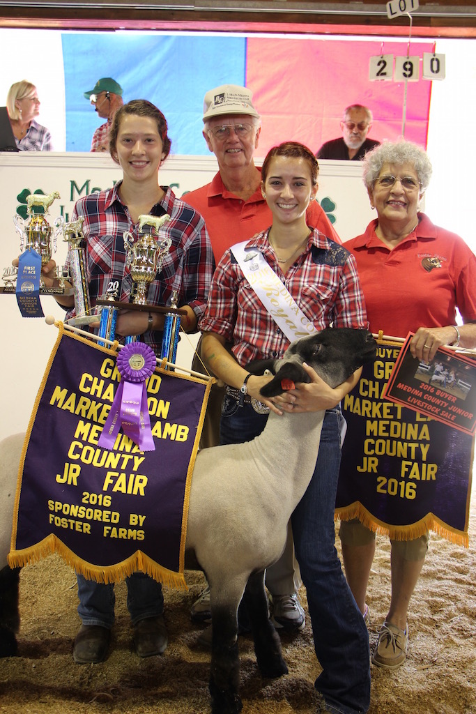 The Medina County Fair grand champion market lamb, weighing 137 pounds, was shown by Whitney Smith, assisted by Lydia Winkler, and purchased by Bill and Judy Foster of Foster Farms, for $11 per pound.