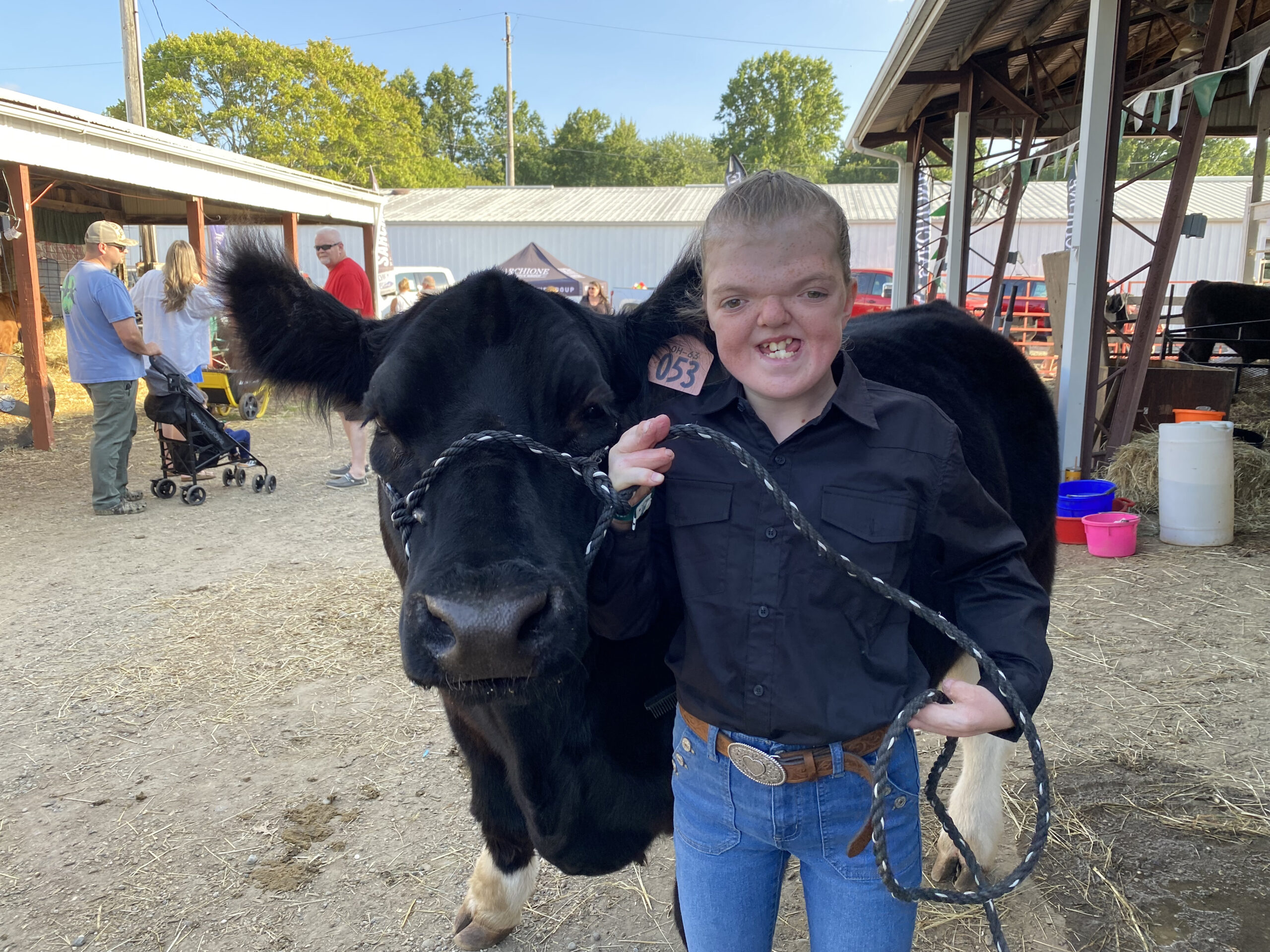 All summer Claire, Danny and the Smiths’ son Luke Smith took turns walking, bathing and feeding their steers. They also held mock showmanship contests that a friend and neighboring farmer, Zach Morehead, judged. Friends and experienced showmen McKenzie and Taylar Whitted instructed the novice showmen and their steers. Claire learned how to use body language instead of verbal commands to communicate with Socks.