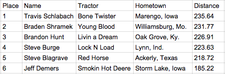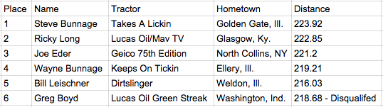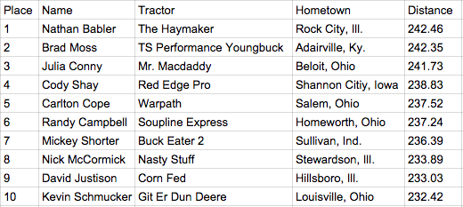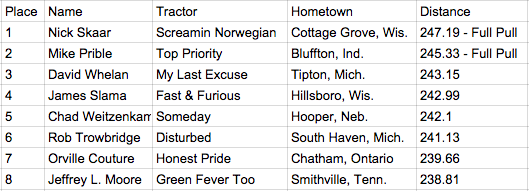 Louisville, Ky. — From the Championship Tractor Pull held in conjunction with the National Farm Machinery Show, Feb. 11-14, the following results were posted from the finals.