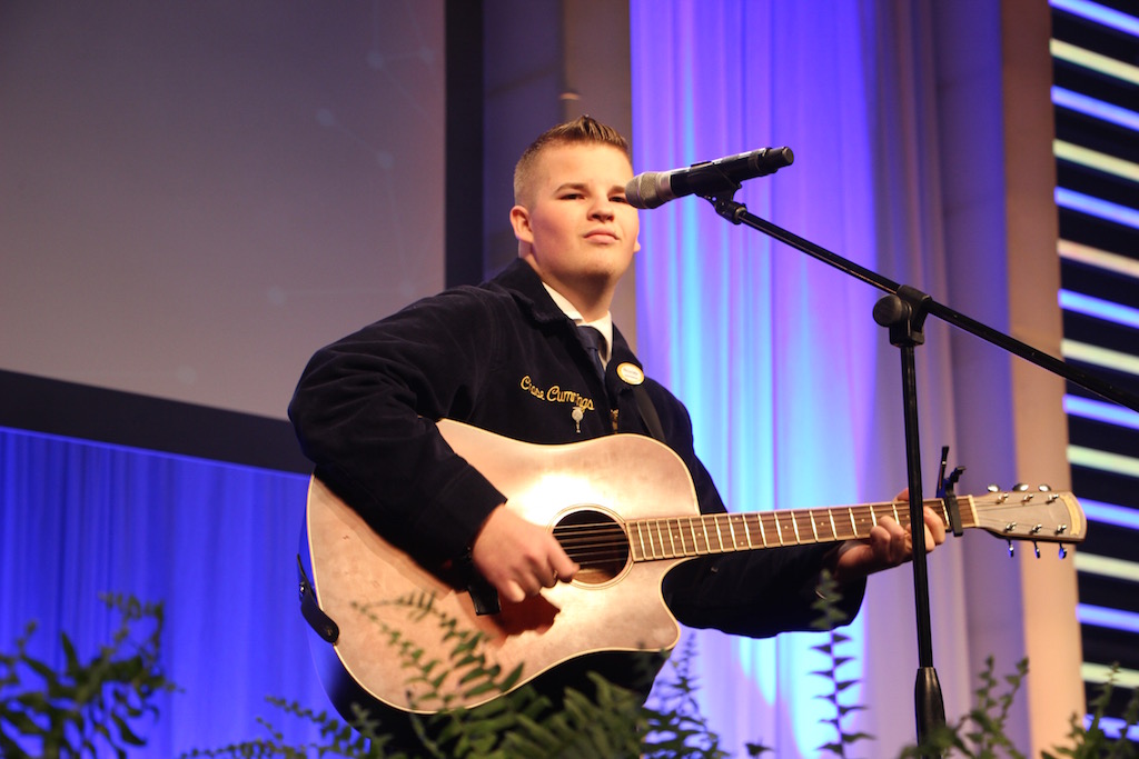 Chase Cummings, of the Waynesfield-Goshen FFA Chapter, sings his original song “Ain’t going nowhere” at the Ohio FFA Convention May 6.