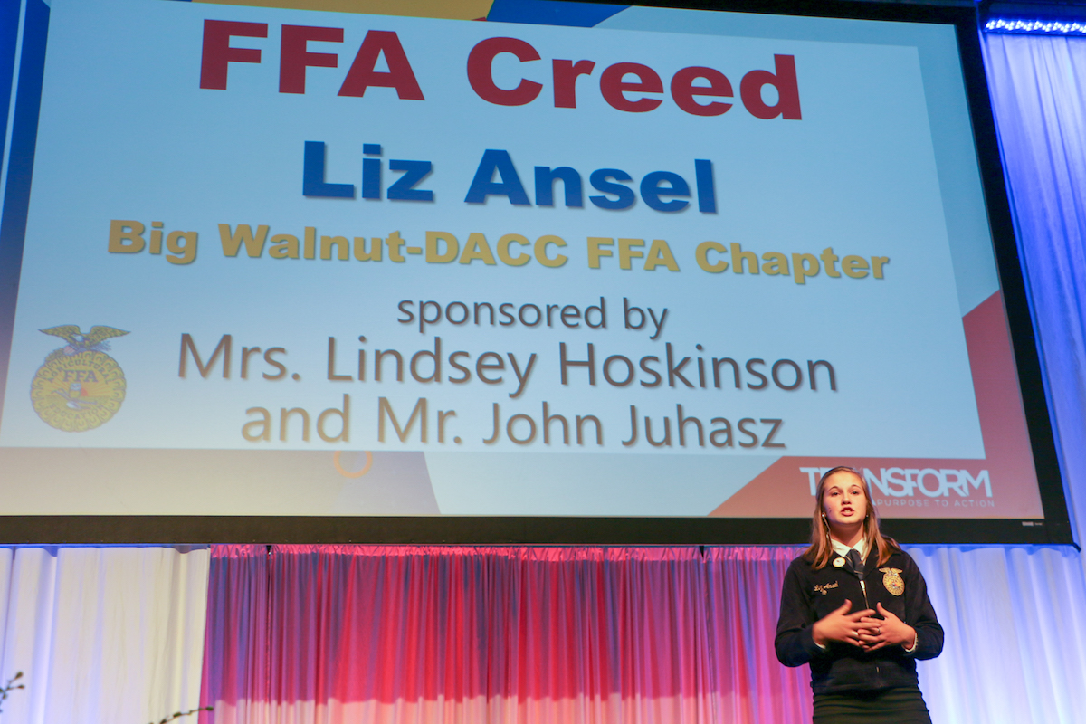 Liz Ansel, Big Walnut-DACC FFA, recites the FFA creed during the fourth session of the Ohio FFA convention May 5. Farm and Dairy photo.