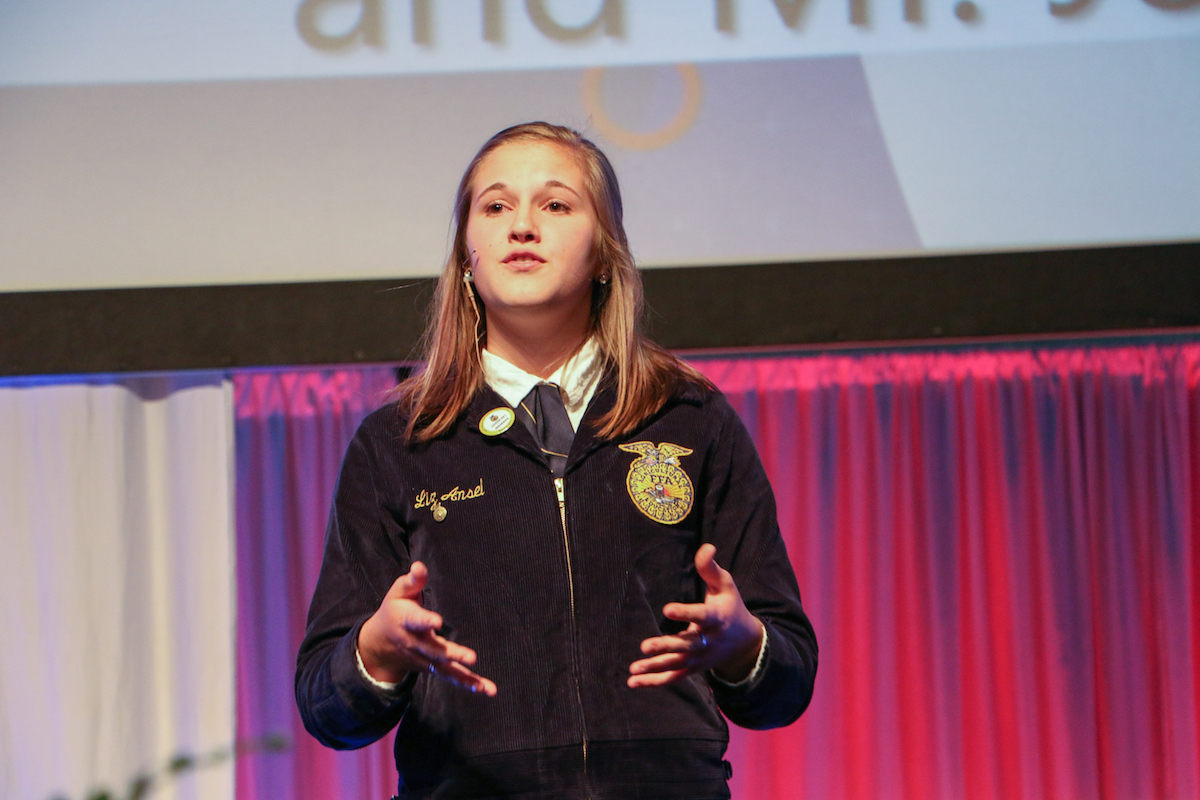 Liz Ansel, Big Walnut-DACC FFA, recites the FFA creed during the fourth session of the Ohio FFA convention May 5. Farm and Dairy photo.