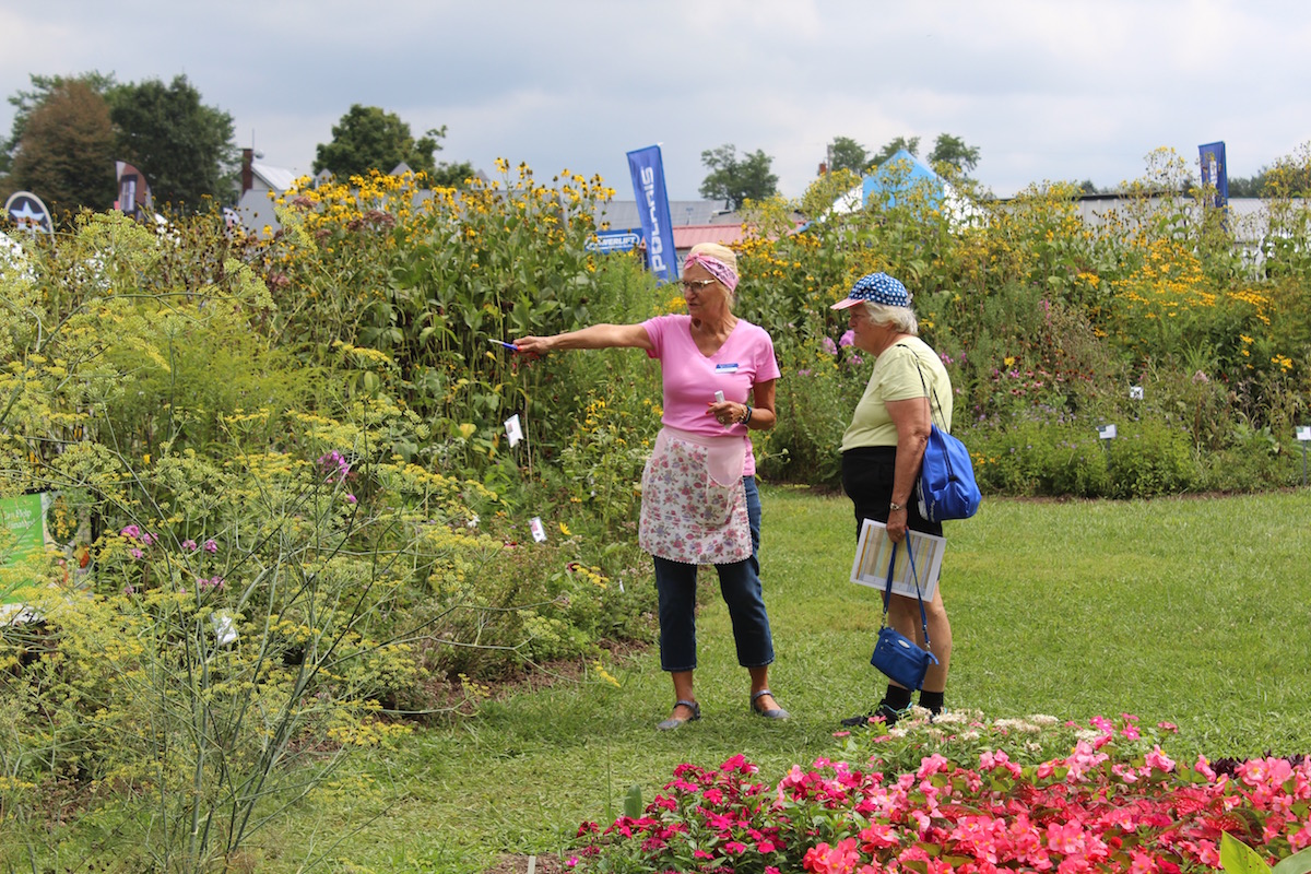 Jo Merrell, a Penn State Master Gardener from Centre County, shows Sue Hamilton, of Grove City, around the pollinator garden at Ag Progress Days. (Rachel Wagoner photo)