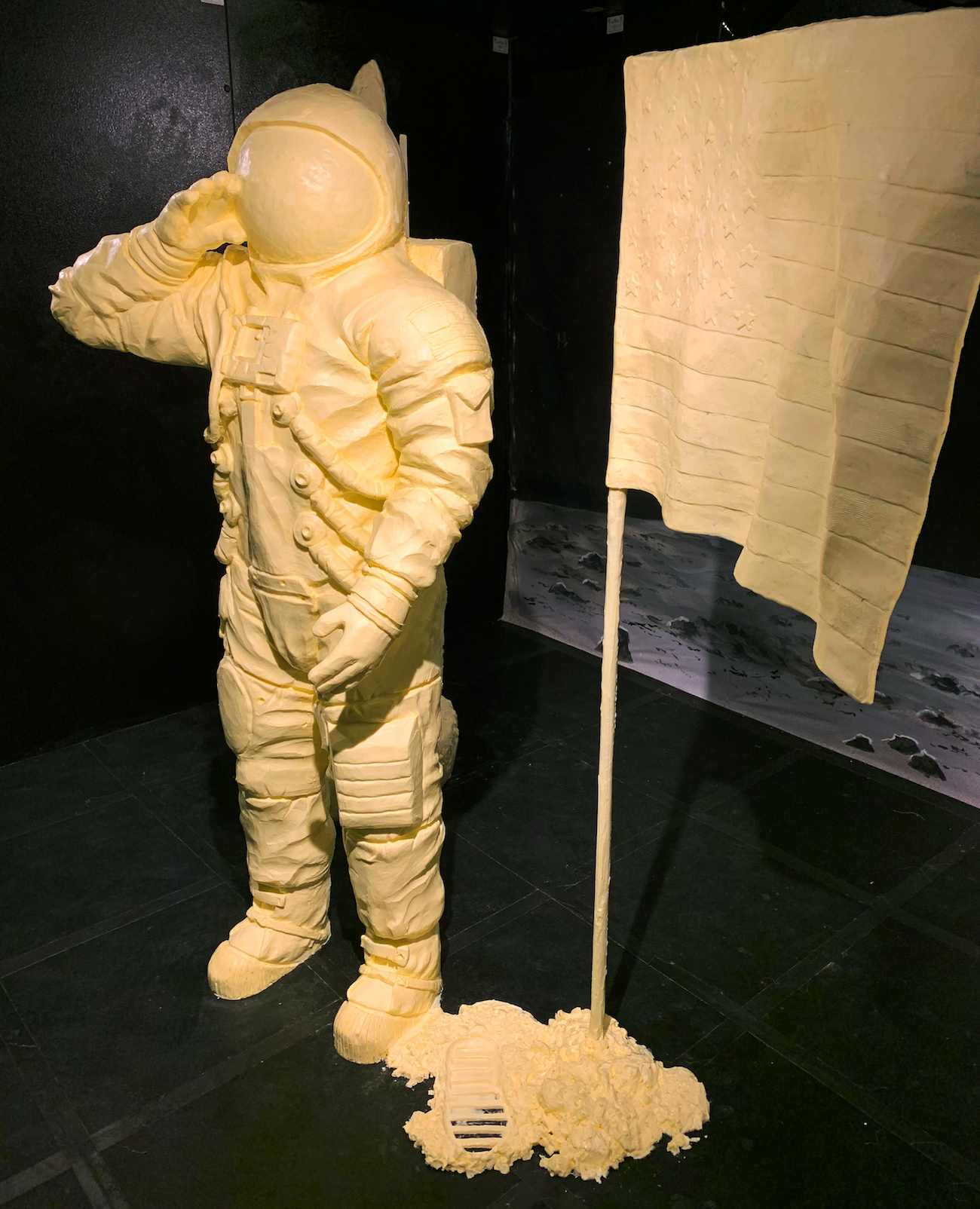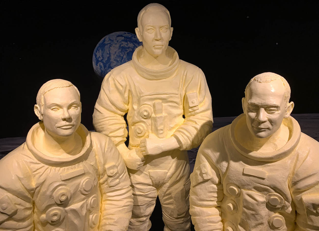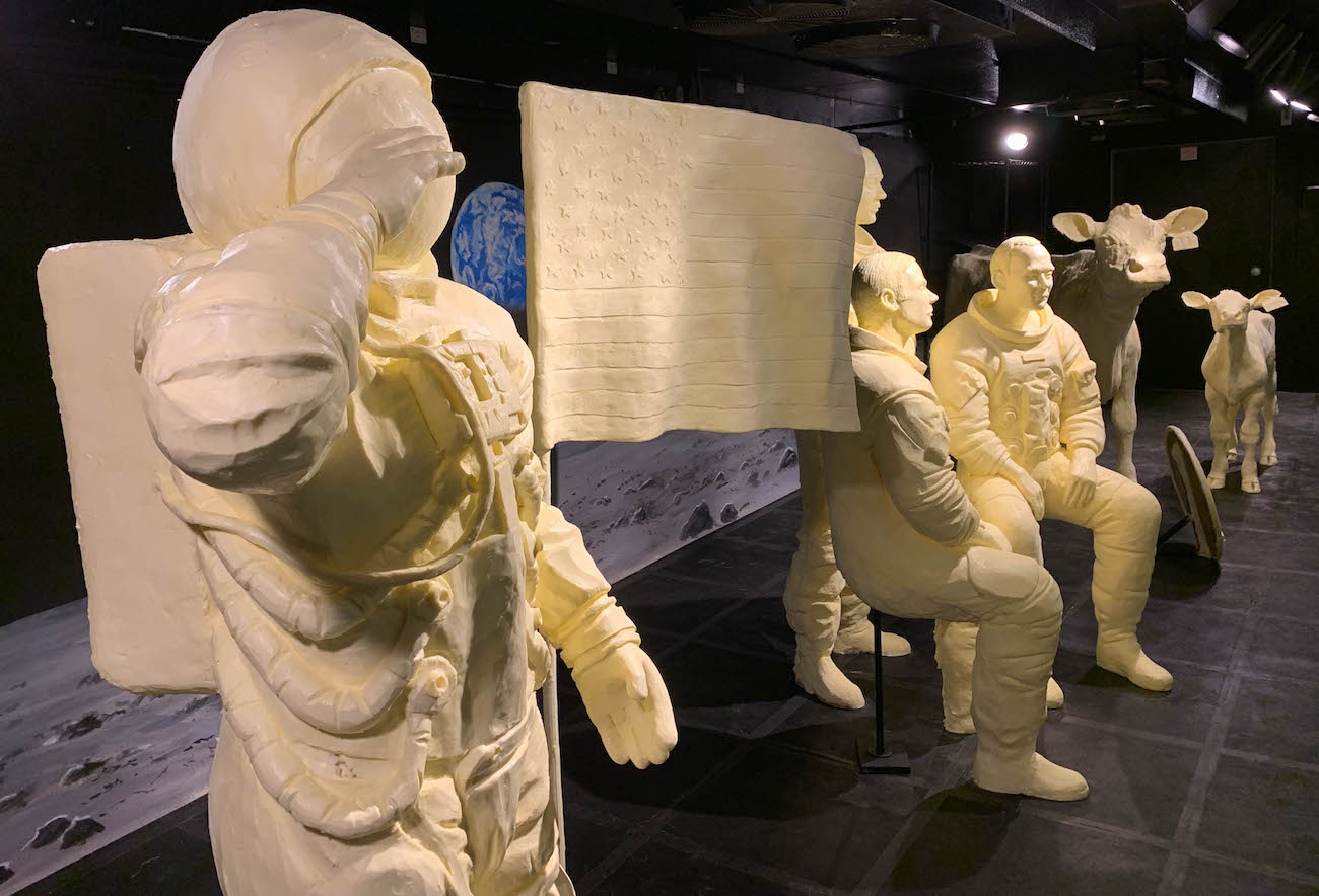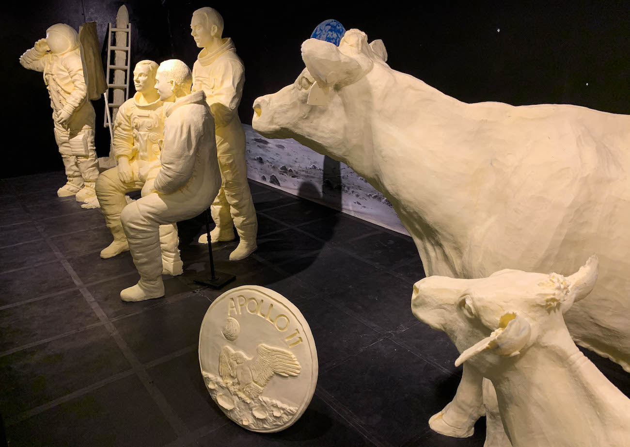 The entire Apollo 11 crew — Armstrong, Buzz Aldrin and Michael Collins — was also recreated in butter. Next to the astronauts are the traditional butter cow and calf, mainstays at the annual display.