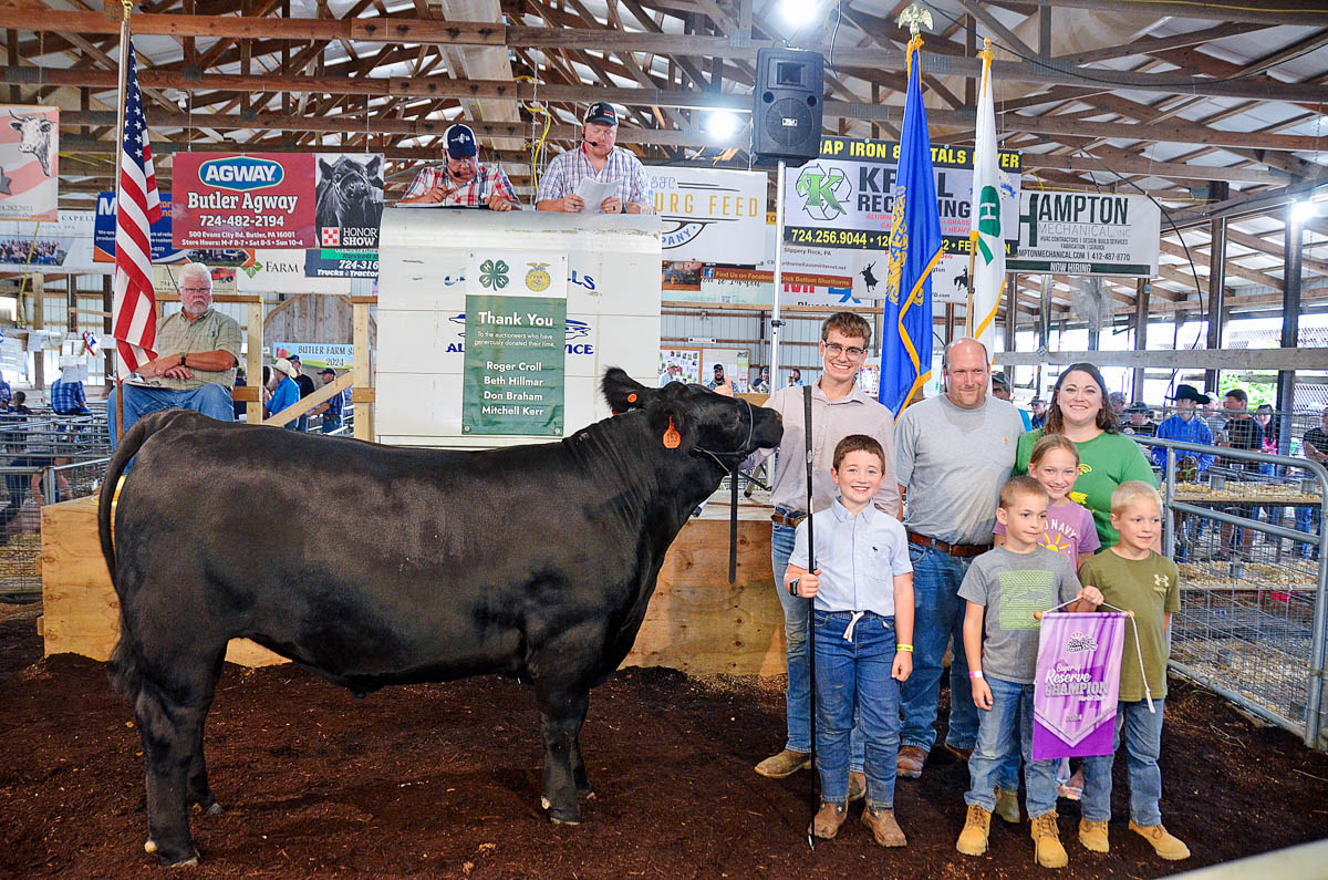 GRAND CHAMPION: Briar Kennedy | Bid: $8/lb | Weight: 1,350 lbs | Buyer: Amerikohl Mining, Inc.; RESERVE CHAMPION: Eli Ambrose | Bid: $8/lb | Weight: 1,415 lbs | Buyer: Oesterling’s Feed