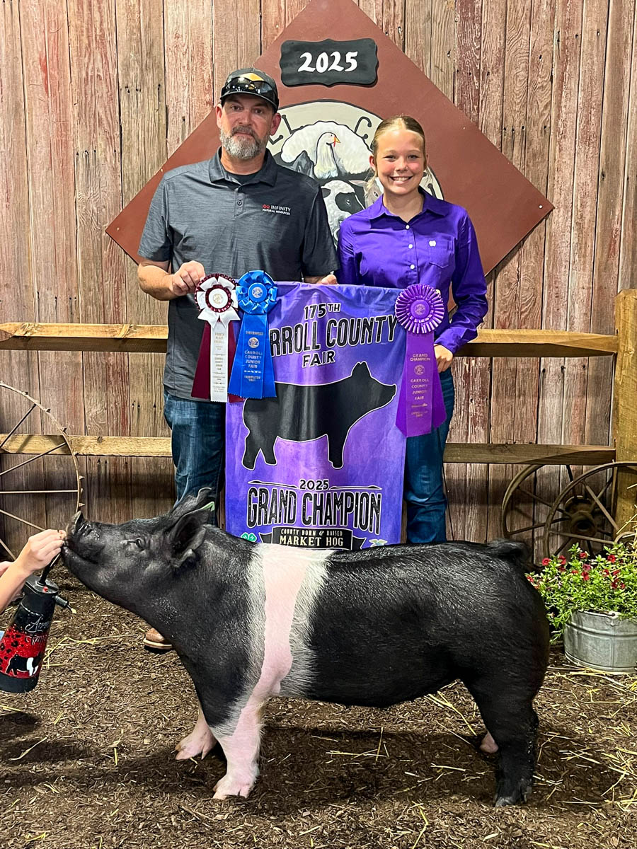 GRAND CHAMPION: Grant D Thompson | Bid: $29/lb | Weight: 269 lbs | Buyer: Kishman’s Fresh Market Iga Malvern And Minerva; RESERVE CHAMPION: Clayton Bevington | Bid: $41/lb | Weight: 271 lbs | Buyer: Airport Ridge Sporting Clays, Polen Meats, Chambers Family Fab, Olde Wood Ltd, Ryan & Amanda Bevington, Ballinger Family, City Limits Western, Joe & Janice Kiko, Laura & Danny Schmucker, Gmc Heating And Cooling, Roy Bevington, Cold Track Llc; GRAND CHAMPION CARCASS HOG: Brantley Buss | Bid: $20/lb | Weight: 176 lbs | Buyer: Hohler Heating And Cooling; RESERVE CHAMPION CARCASS HOG: Ellie Masalko | Bid: $16/lb | Weight: 194 lbs | Buyer: All American Scales And Calibration; GRAND CHAMPION COUNTY BORN & RAISED: Avery Catlett | Bid: $30/lb | Weight: 228 lbs | Buyer: Infinity Natural Resources; RESERVE CHAMPION COUNTY BORN & RAISED: Melah Essick | Bid: $26/lb | Weight: 240 lbs | Buyer: David Catlett Construction
