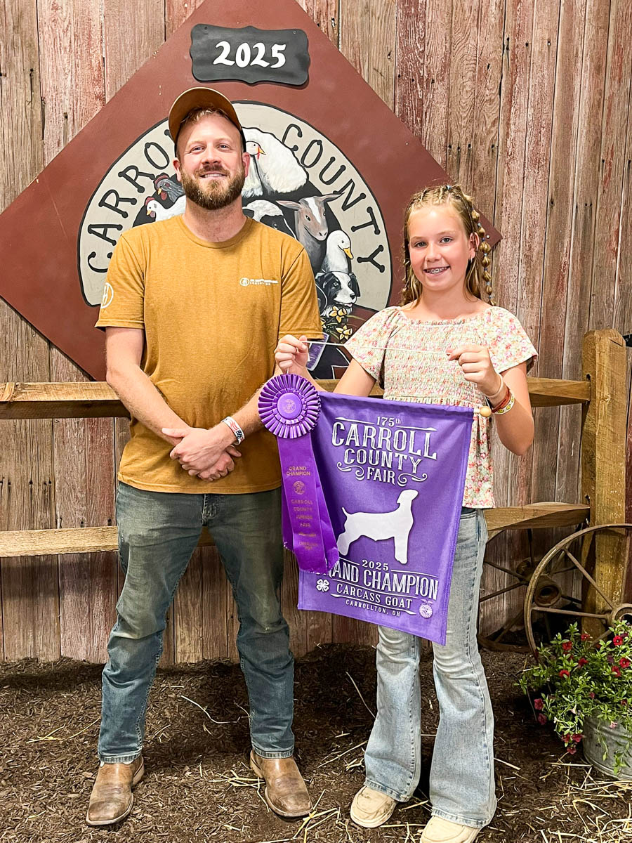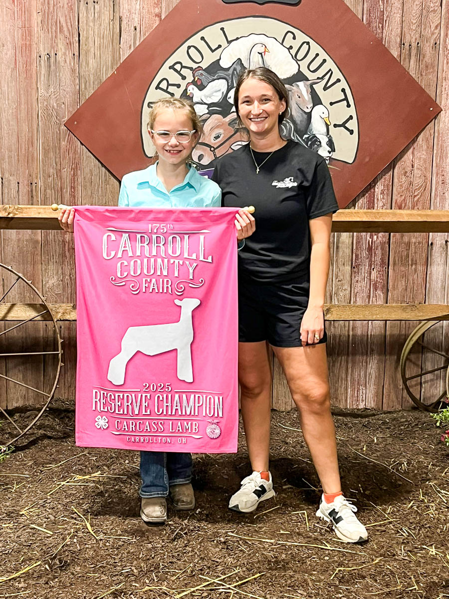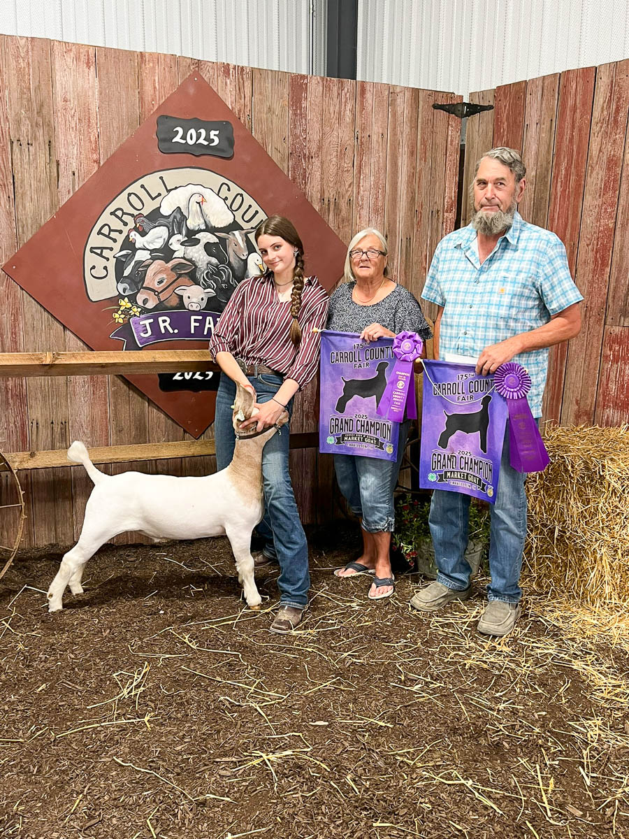 GRAND CHAMPION & GRAND CHAMPION COUNTY BORN & RAISED: Malia Schaar | Bid: $40/lb | Weight: 82 lbs | Buyer: Martin & Michelle Brumbaugh; RESERVE CHAMPION: Henry Campbell | Bid: $3/lb | Weight: 89 lbs | Buyer: Allison Family Farms LLC; GRAND CHAMPION CARCASS GOAT: Bay Mulheman | Bid: $26/lb | Weight: 41 lbs | Buyer: AK Environmental Consulting – Austin Kirk; RESERVE CHAMPION CARCASS GOAT: Gage Thompson | Bid: $27/lb | Weight: 45 lbs | Buyer: Fresh Off The Farm, LLC; RESERVE CHAMPION COUNTY BORN & RAISED: Malia Schaar | Bid: $10.50/lb | Weight: 108 lbs | Buyer: Dr. Fry-Aultman Orrville Carrollton Schools Health Center