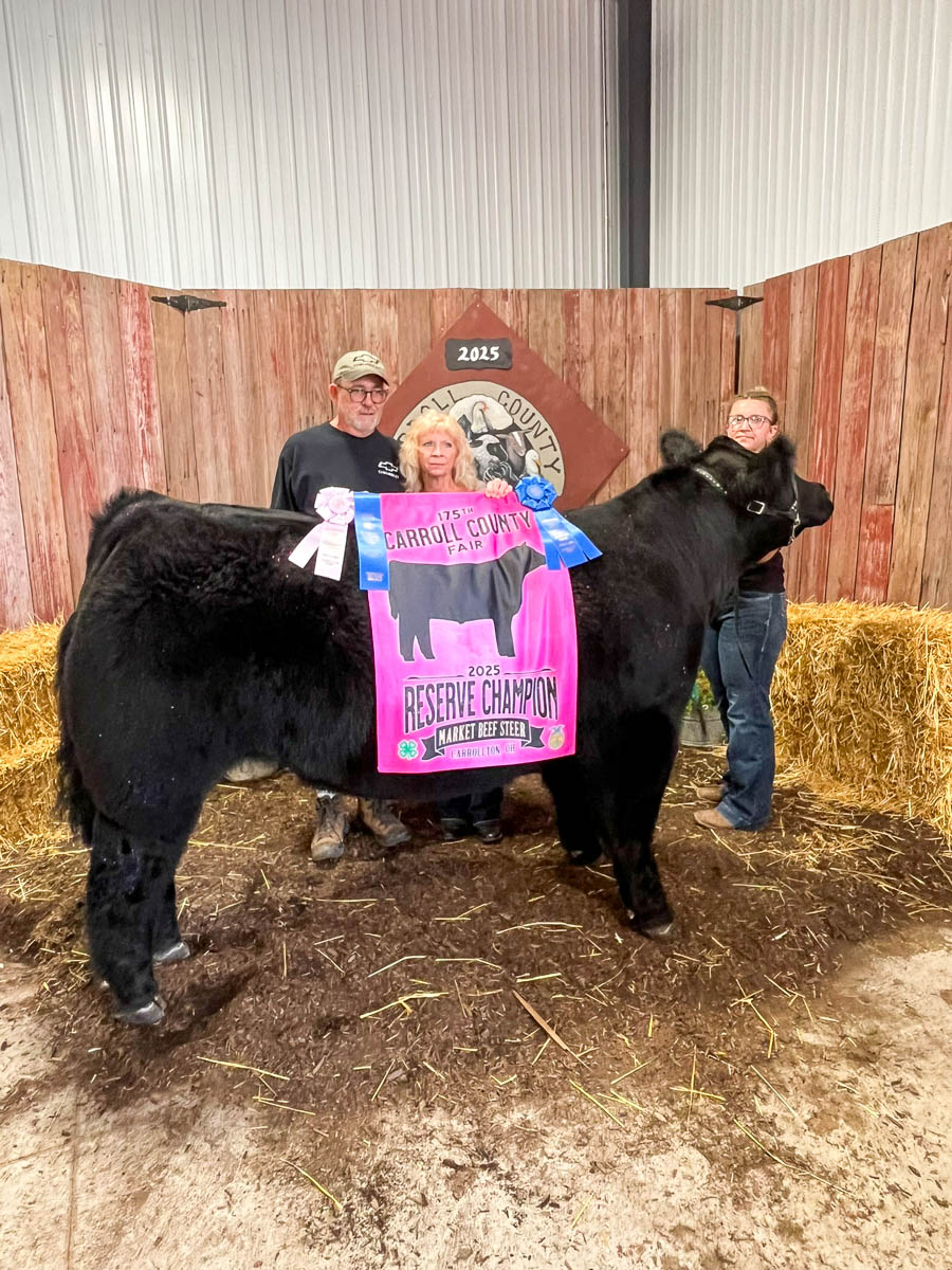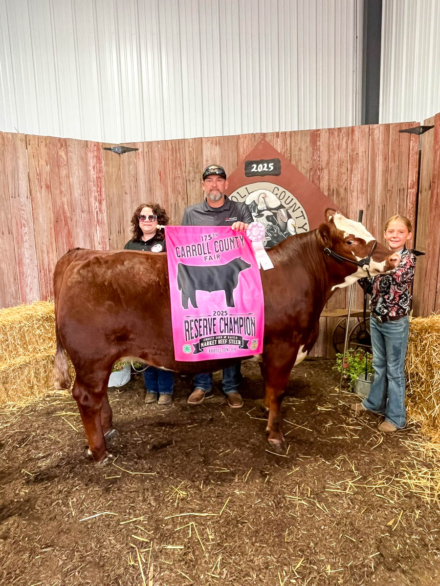 GRAND CHAMPION: Lane Hawk | Bid: $13/lb | Weight: 678 lbs | Buyer: Vernon Dell; RESERVE CHAMPION/GRAND CHAMPION COUNTY BORN & RAISED: Skylar Wright | Bid: $5/lb | Weight: 717 lbs | Buyer: Guess Motors/Guess Ford; RESERVE CHAMPION COUNTY BORN & RAISED: Liberty Frase | Bid: $4.10/lb | Weight: 683 lbs | Buyer: Consumers National Bank