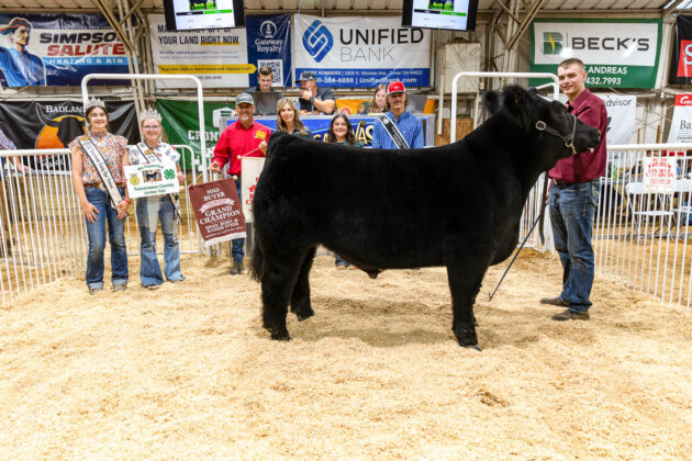 GRAND CHAMPION: Kate Liggett | Bid: $25/lb | Weight: 1,431 lbs | Buyer: Sarchione Chevrolet; RESERVE CHAMPION: Cale Dinger | Bid: $12/lb | Weight: 1,344 lbs | Buyer: MRE Services Inc.