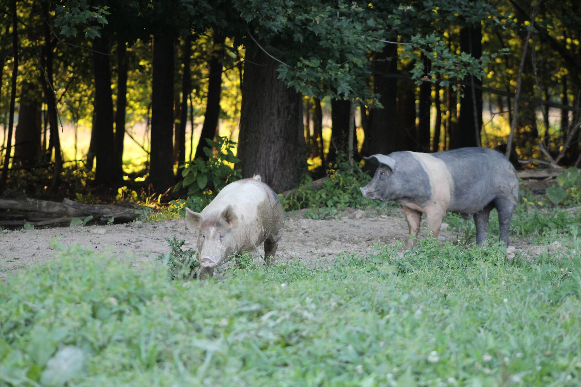 The farm consists of 107 acres, with each species kept separate from the other. The hogs and the cattle are pasture-based, but have access to separate wooded areas for shade and shelter, and the hogs have an outdoor hut that is bedded during winter.