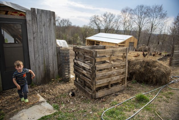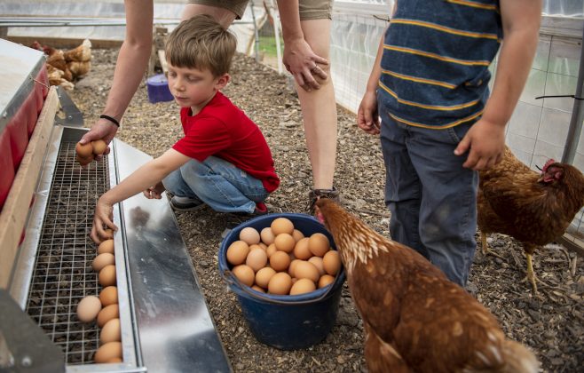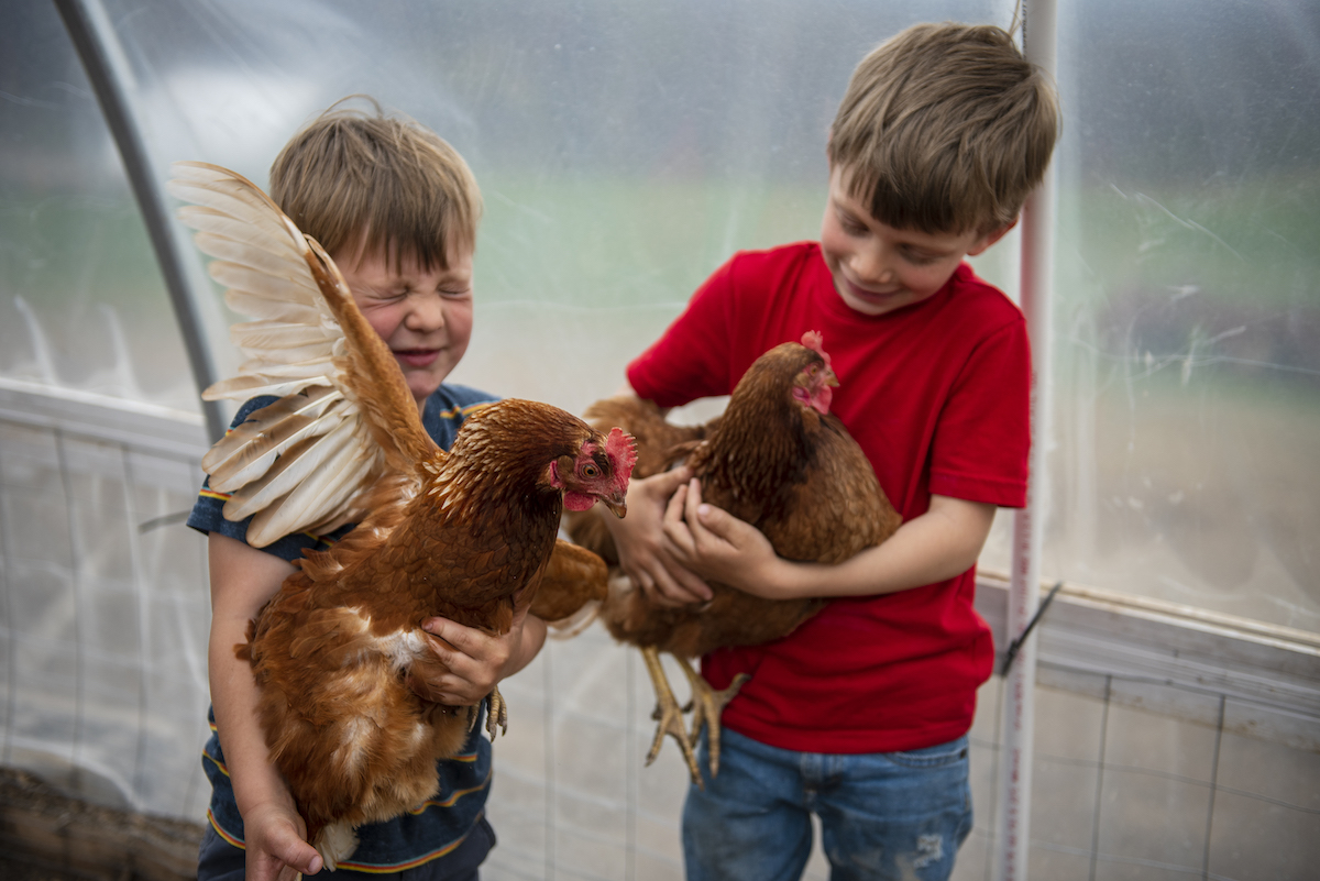 The falling down barn is gone. They’re building a new one this year. Another thing on the list is to put up new fence, so they can stop relying on temporary fencing. Their children now are 5 and 3. They boys can help collect eggs, with supervision. They also carry feed out to the chickens.