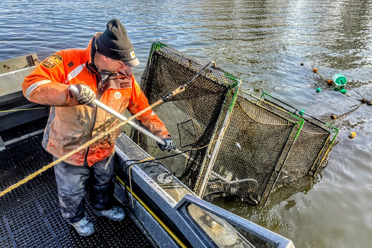 Division staff put their nets out in shallow water where they hope to find more females, as well as more that are ready to release their eggs.