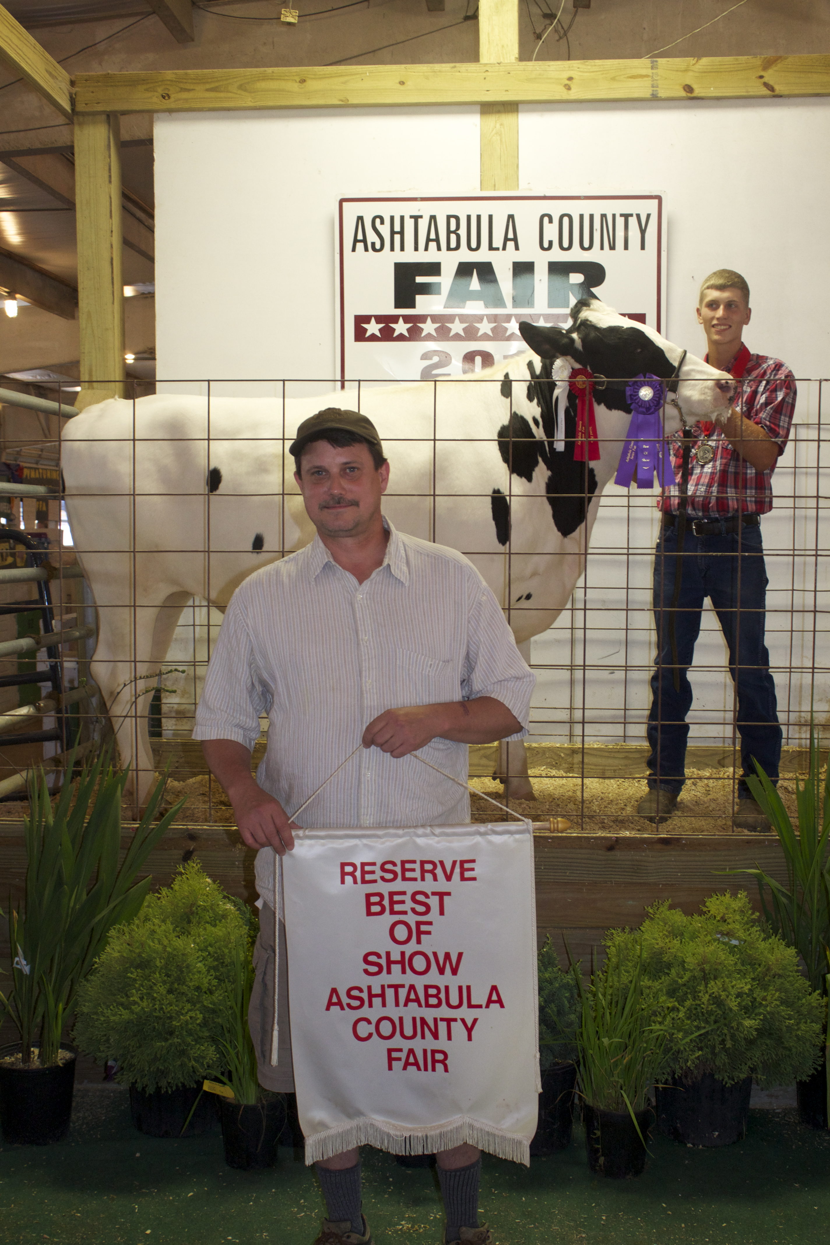 Jackson Bogardus won reserve best of show with his 1,305-pound dairy steer. He garnered $2.20 a pound after it sold to Andover Bank. Pictured is Mark Hanneman.