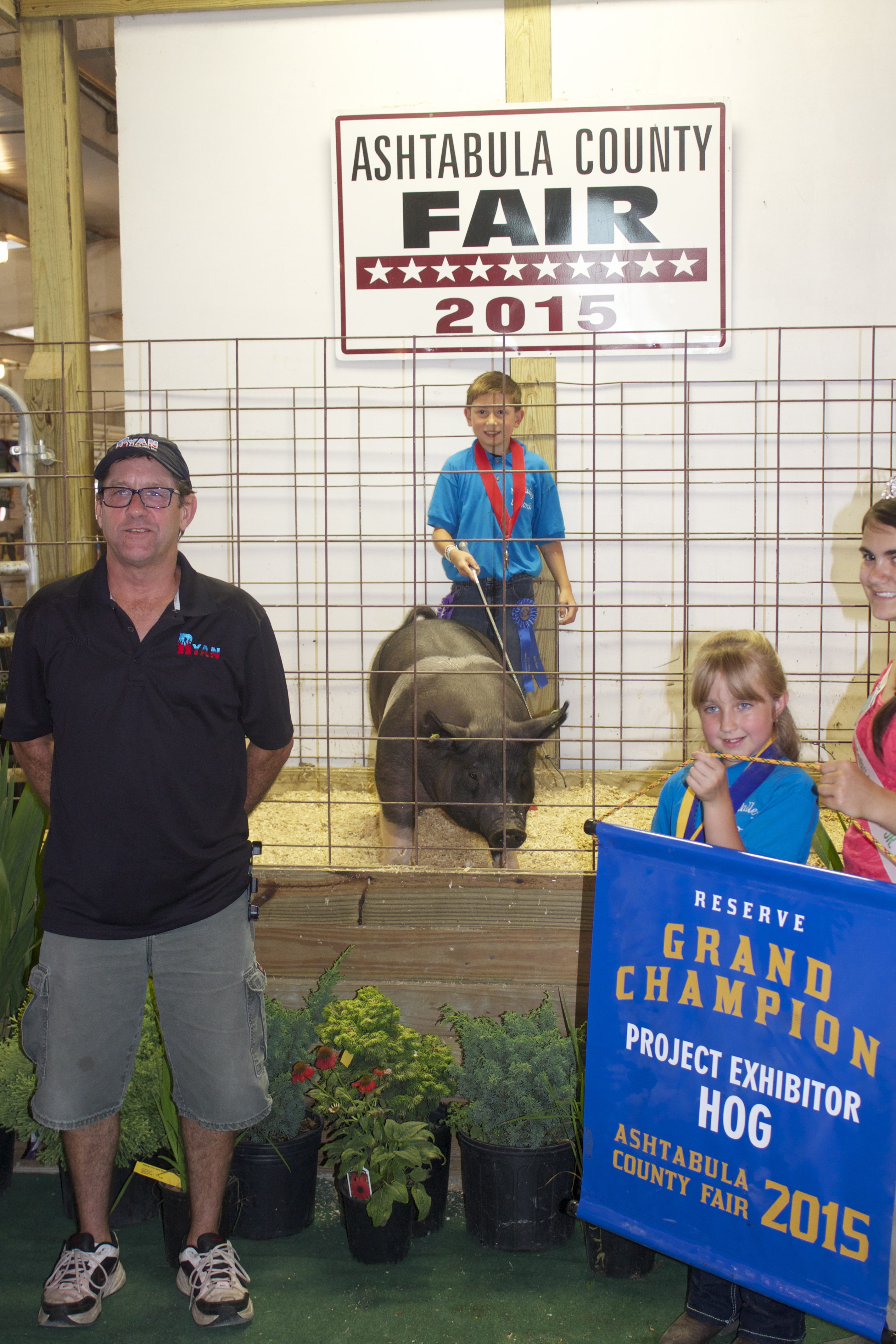 The reserve champion hog exhibitor at the Ashtabula County Fair was Taylor Edelman. The hog weighed 267 pounds and sold for $5 a pound to Ryan’s Heating and Cooling. Pictured is Miley Edelman who was standing in for Taylor and Matthew Mazzaro.