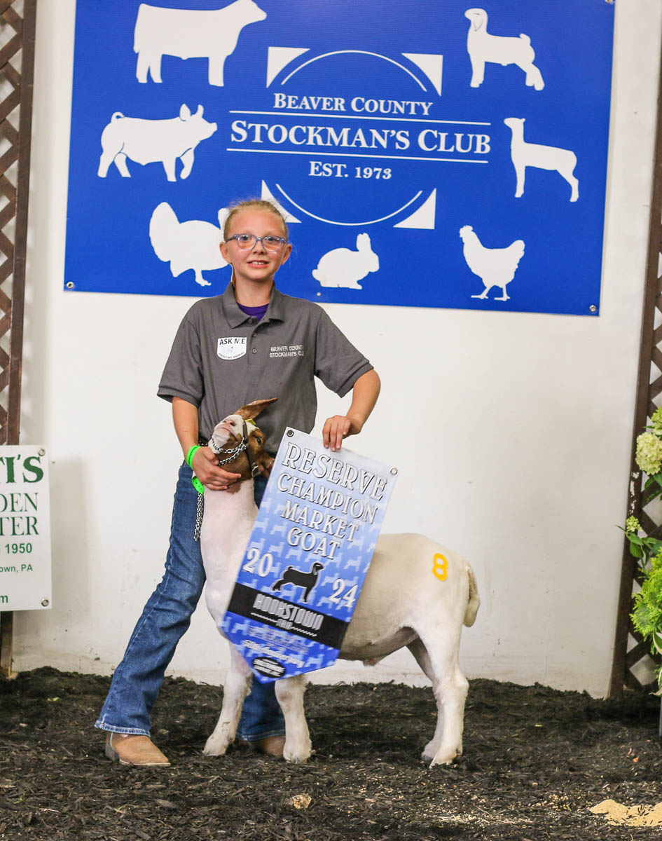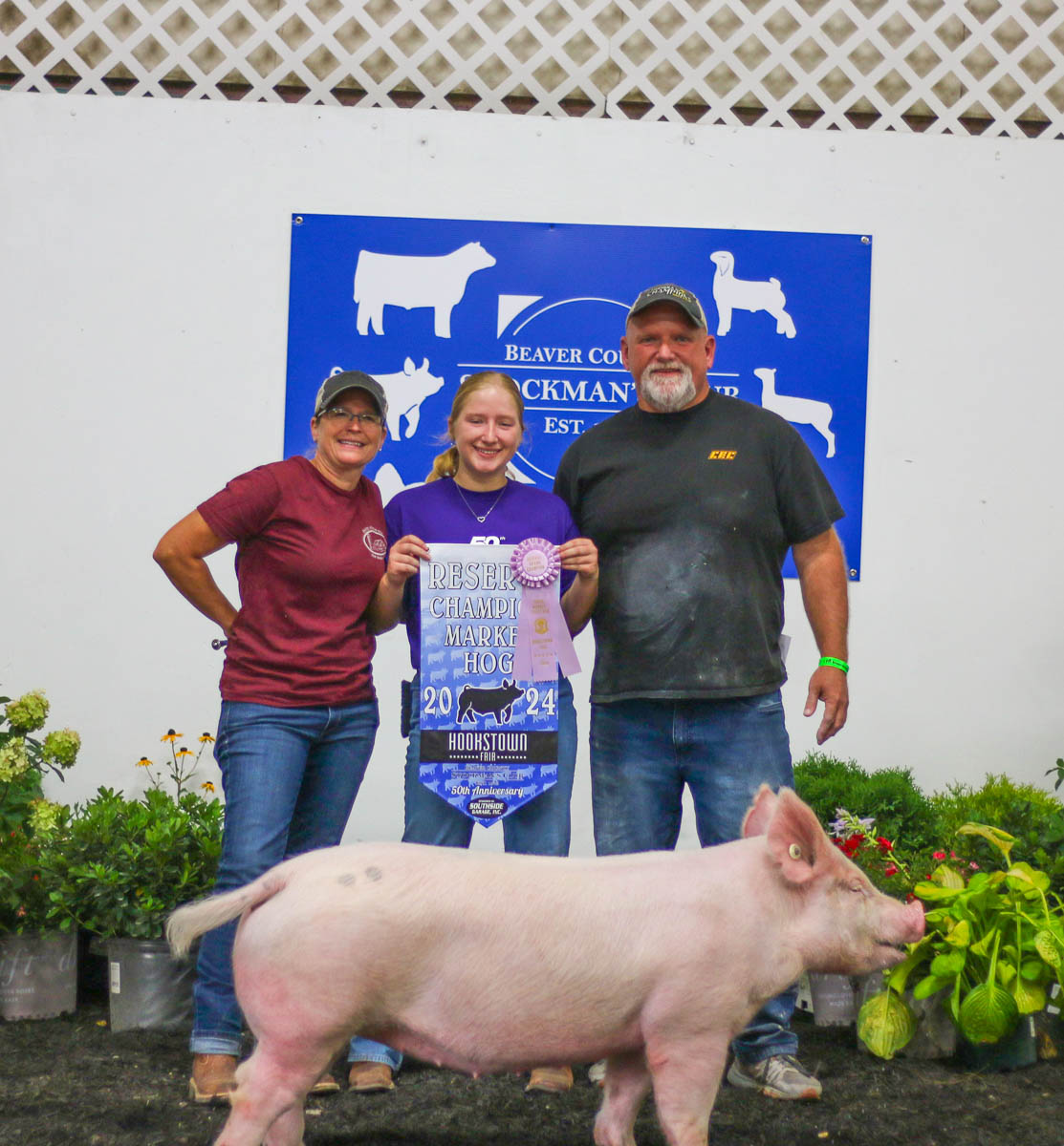 GRAND CHAMPION: Audrey Parsons | Bid: $15/lb | Weight: 134 lbs | Buyer: Bioni Industries; RESERVE CHAMPION: Madison Morrow | Bid: $12/lb | Weight: 130 lbs | Buyer: Janoski Farms