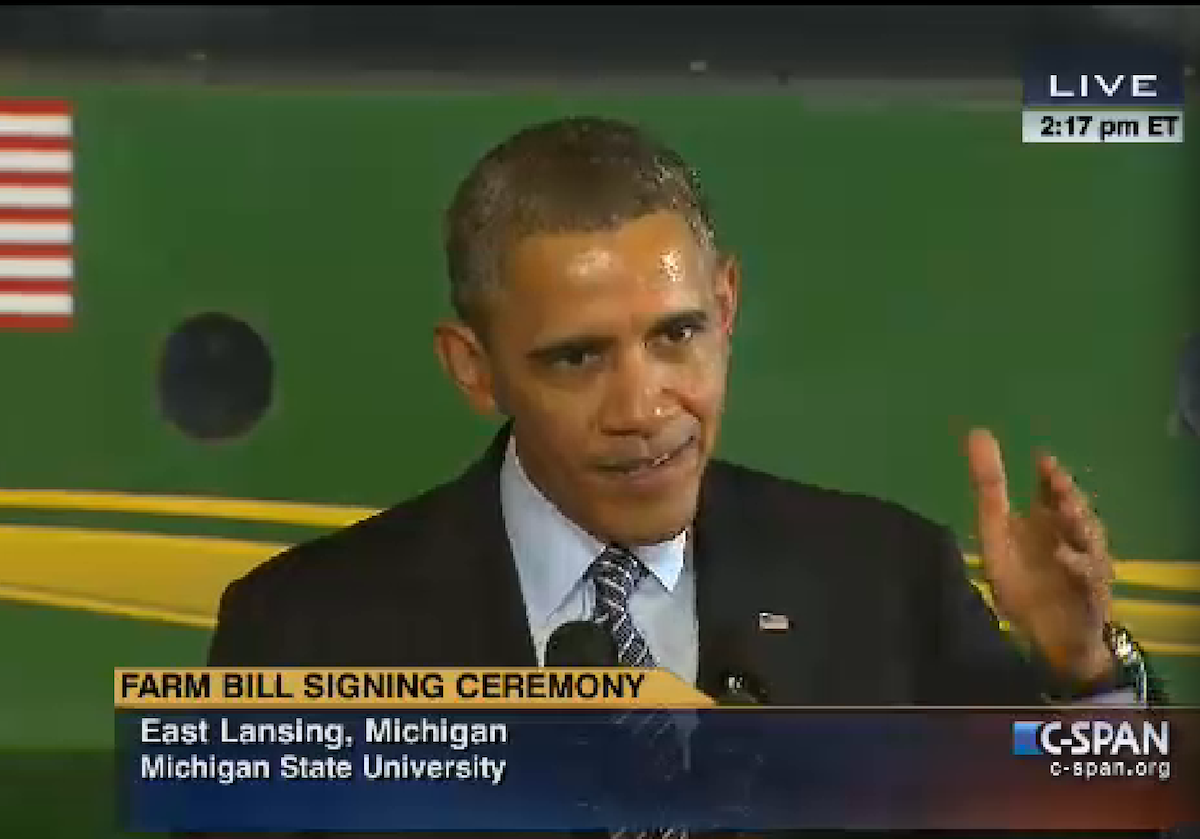 Obama reminded the crowd that the farm bill is also about feeding people, especially the needy. About 80 percent of the bill goes toward food stamps and nutrition programing.