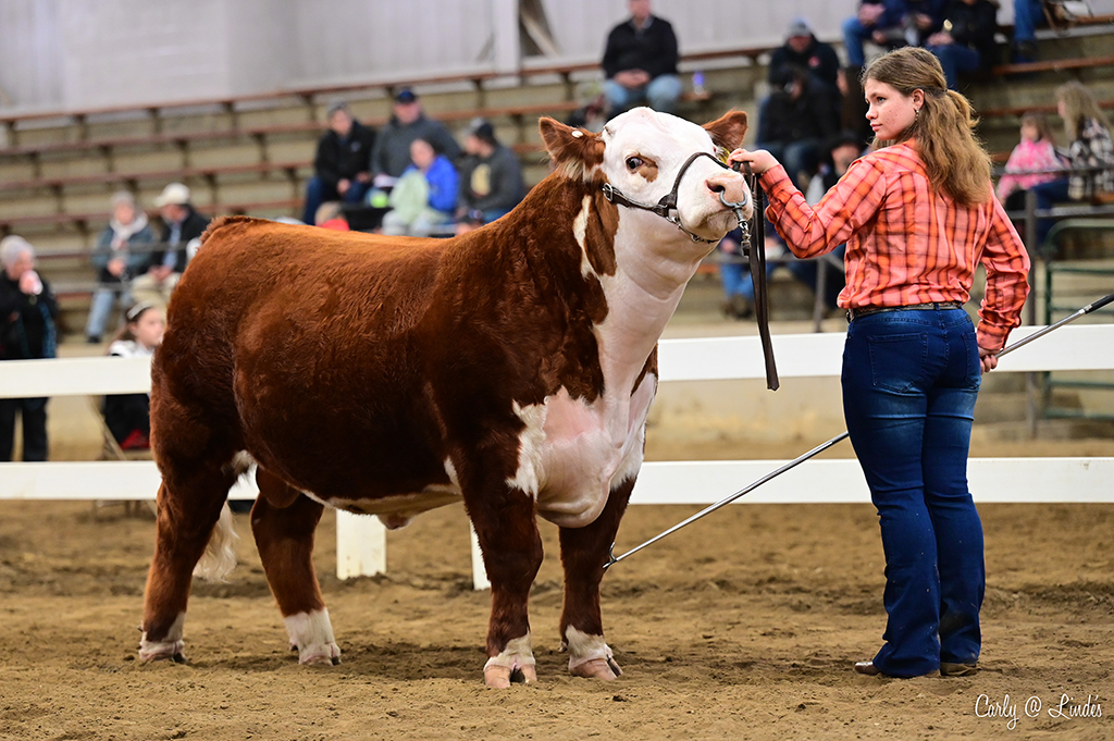 This year’s Hereford judge, Taylor Feikert from Millersburg, Ohio, assessed 36 lots of cattle spread across 12 classes in Cooper Arena. Feikert viewed the animals from various angles and had them move in the ring before ranking them.