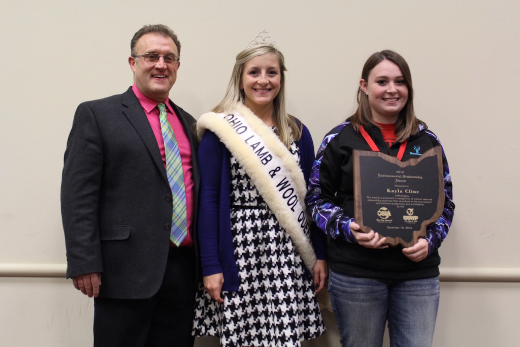 The Ohio Sheep Improvement Association’s Environmental Stewardship Award went to Kayla Cline, of Athens and Meigs counties. She was joined by OSIA Executive Director Roger High (left), and sheep queen Autumn Miller (center).