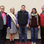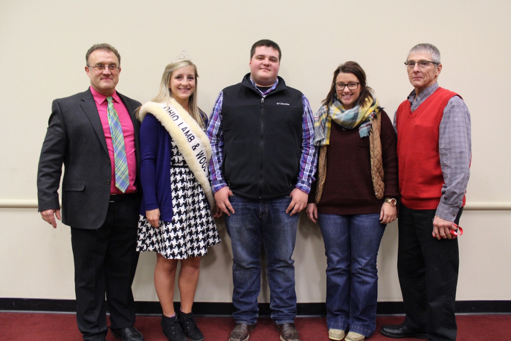 The Ohio Sheep Industry Distinguished Service Award went to Rory Lewandowski (left), OSU Extension educator, Wayne County; Thurman Mullett, Mount Hope Auction; and Daryl Clark, OSIA past president. They were pictured with Ohio Lamb and Wool Queen Autumn Miller, of Fairfield County, and new OSIA President Mark McCabe (right).