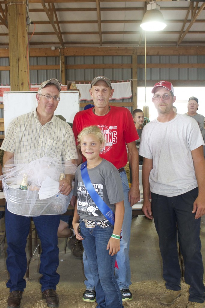 Kylee Jones’ 586-pound reserve champion dairy beef feeder sold for $5.50 a pound to Sprosty Bag, represented by Jason Jones. Also pictured are outstanding youth Renee Reisner and Samuel Kulifay.