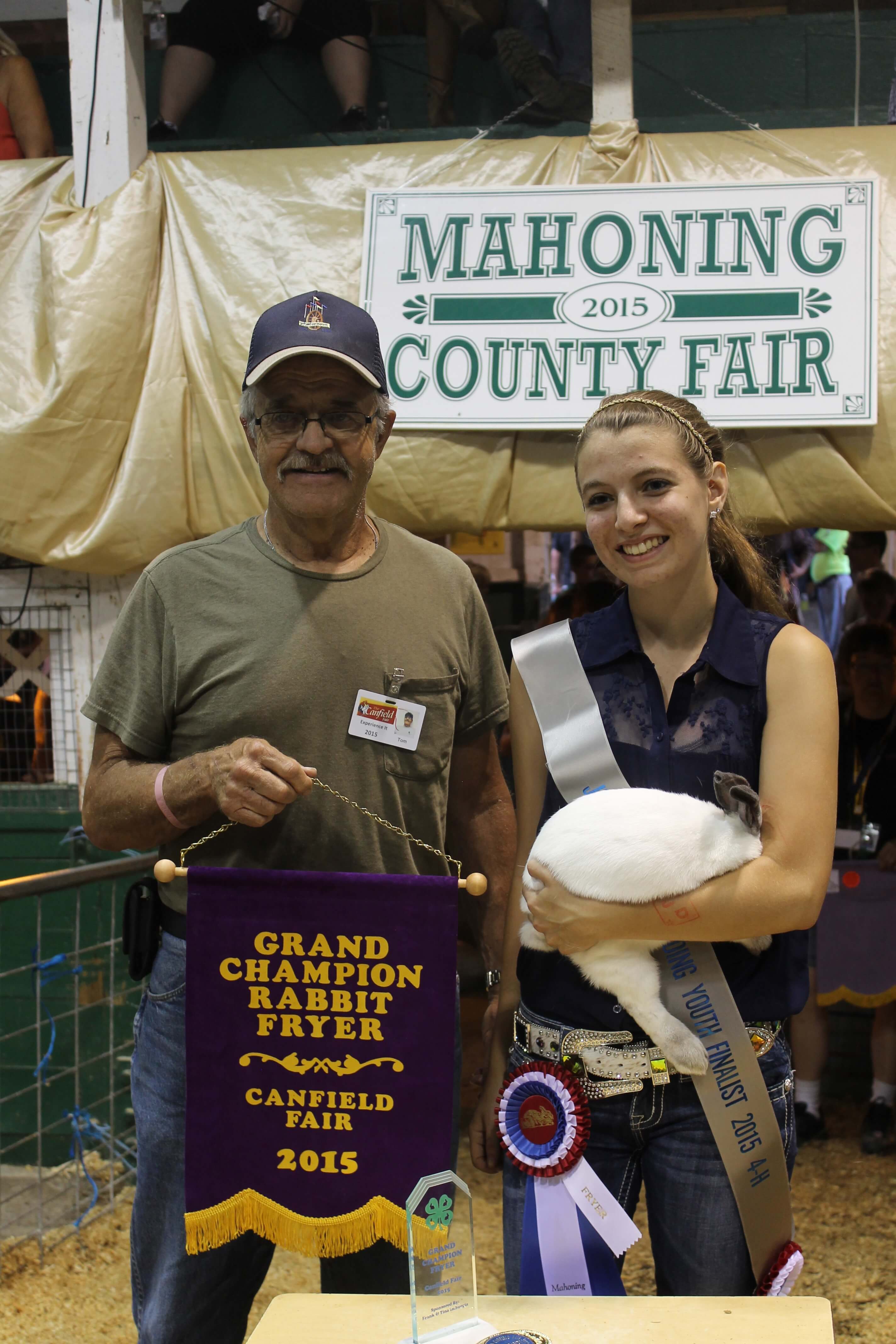 Katie Prosser sold her grand champion pen of fryer rabbits weighing 5.3 pounds to the Penn/Ohio Rabbit Breeders for $400. Pictured is Tom Moore, the owner.