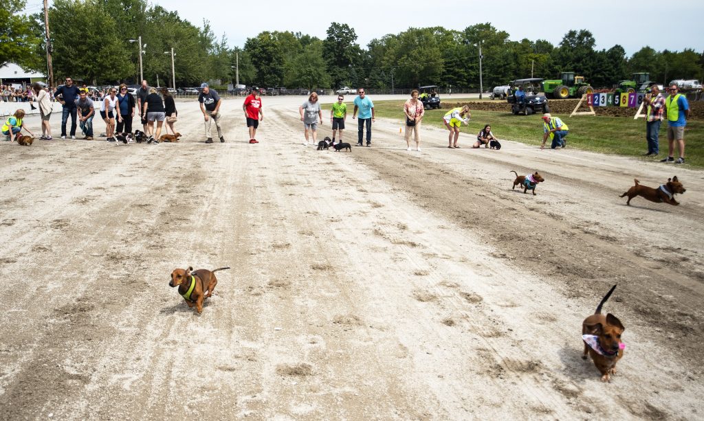 At the Canfield Fair’s inaugural wiener dog race, 46 dogs competed in three heats, with a fourth heat including the top three from each previous race to determine the final winners.