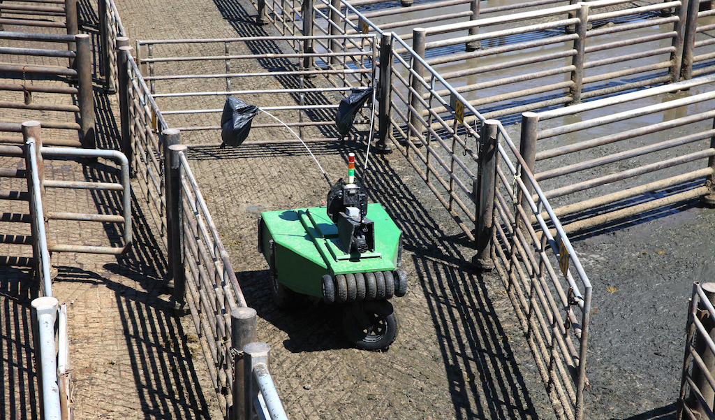 Employees operate the robots from a catwalk located above the pens, reducing safety risks by keeping those who work in the cattle yard portion of processing plants at a greater distance from the 1,300-pound animals.