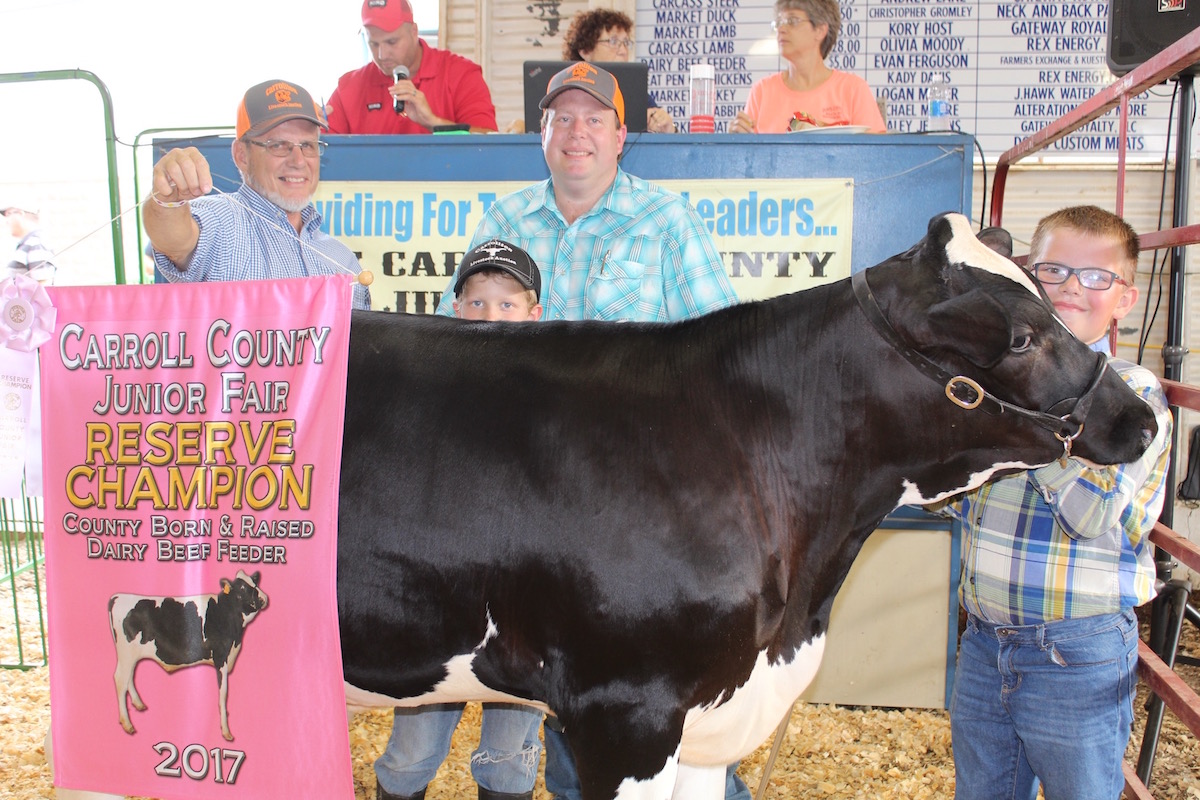 Lane Hawk sold his 628-pound reserve champion born and raised dairy beef feeder for $2.50 a pound to Carrollton Livestock Auction, represented by Phil and Larry Nisly, along with Lane, center.